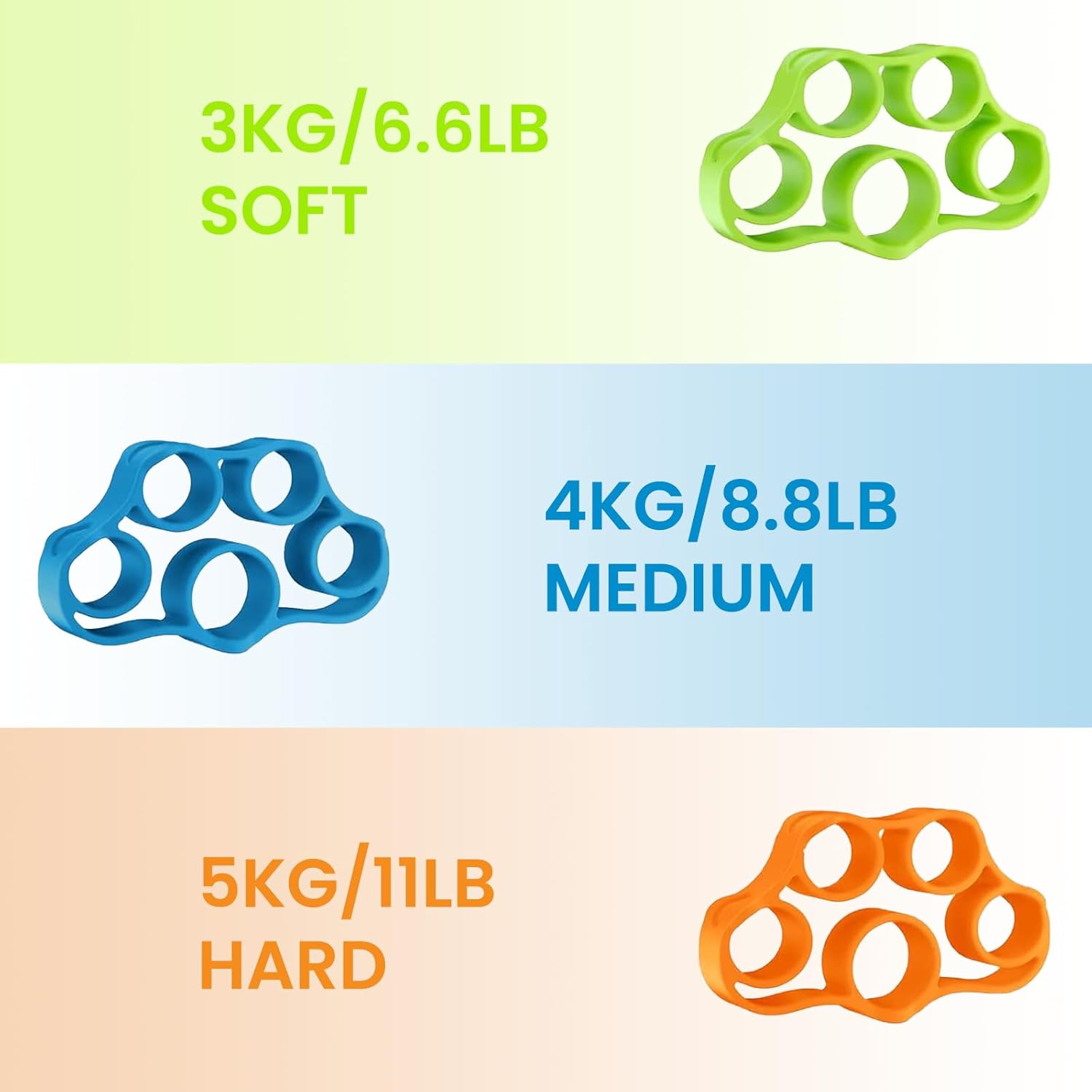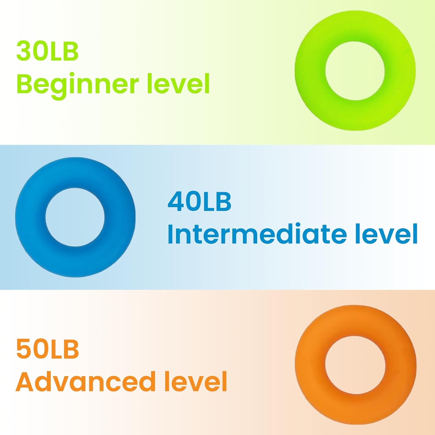 - Set includes 3 levels of hand grip rings: 30 lb, 40 lb, and 50 lb; 3 levels of finger stretchers: 6.6 lb, 8.8 lb, and 11 lb. You can use different bands based on force requirements.
