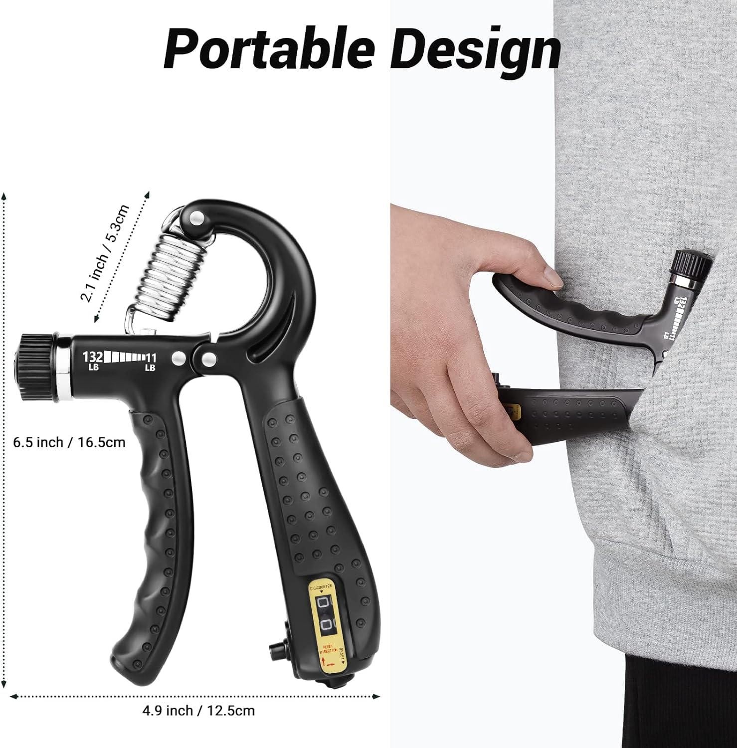 Details: Counting Grip Strength Trainer with Built-In Counter – Adjustable Hand Strengthener for Fitness, Rehabilitation, and Strength Training Product Features: Built-In Counting Function: Track your progress effortlessly with the integrated counter that records each squeeze. Just press the button to count, and press and turn the bottom button to clear the count. Monitor your training data accurately and stay motivated! Adjustable Resistance: Customize your workout with adjustable resistance levels. Suitable for beginners to advanced users, this grip strengthener helps you improve hand, finger, and forearm strength at your own pace. Ergonomic Design: Designed with comfort in mind, featuring non-slip grips and a contoured handle that fits comfortably in your hand. Perfect for extended training sessions without causing discomfort. Durable Construction: Built from high-quality materials to withstand rigorous use. The robust design ensures longevity and reliability, making it ideal for regular workouts. Versatile Use: Ideal for fitness enthusiasts, athletes, and individuals undergoing rehabilitation. Strengthen your grip for sports, improve dexterity, and support recovery from hand injuries.