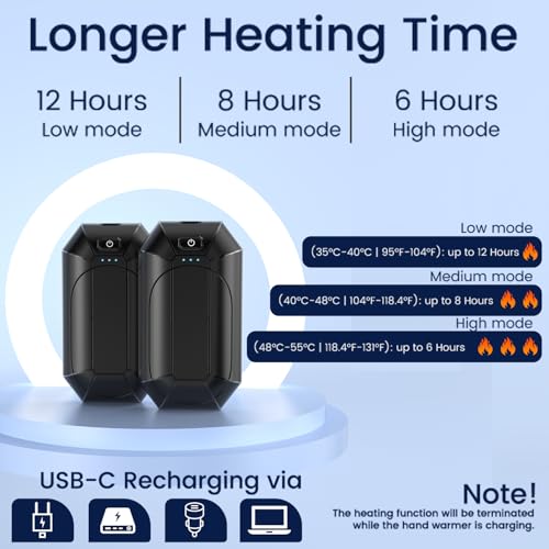 - Instant Heat & Long-lasting Use: Press and hold the switch, You can get warm in 2-3 seconds. You can also choose Low(95¡ÆF-104¡ÆF ), Medium (104¡ÆF-118.4¡ÆF)) and High (118.4¡ÆF-131¡ÆF) temperature mode according to your needs, and the working time is 12 hours, 8 hours, and 6 hours respectively. A must-have in the cold winter, especially for Raynaud's syndrome and arthritis sufferers