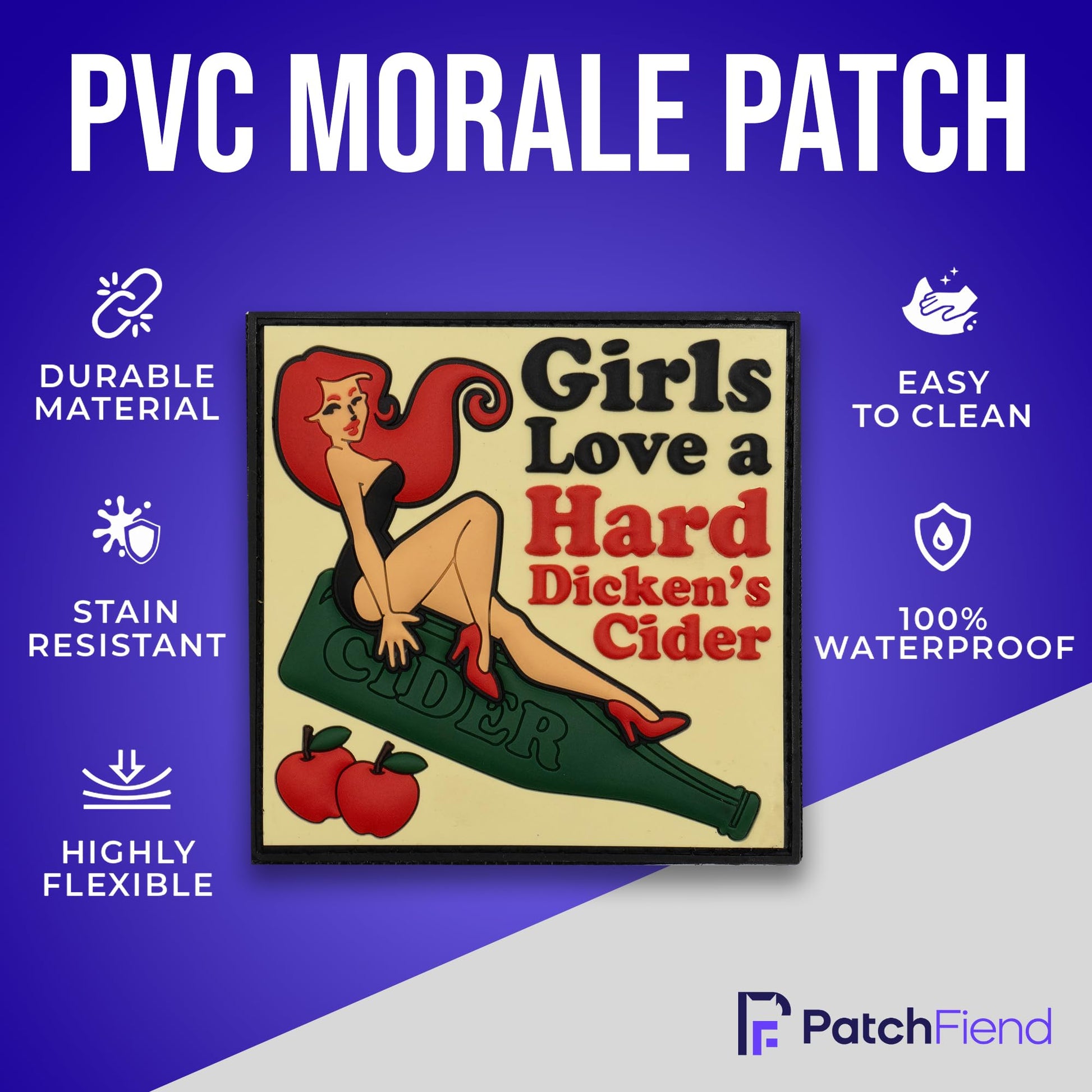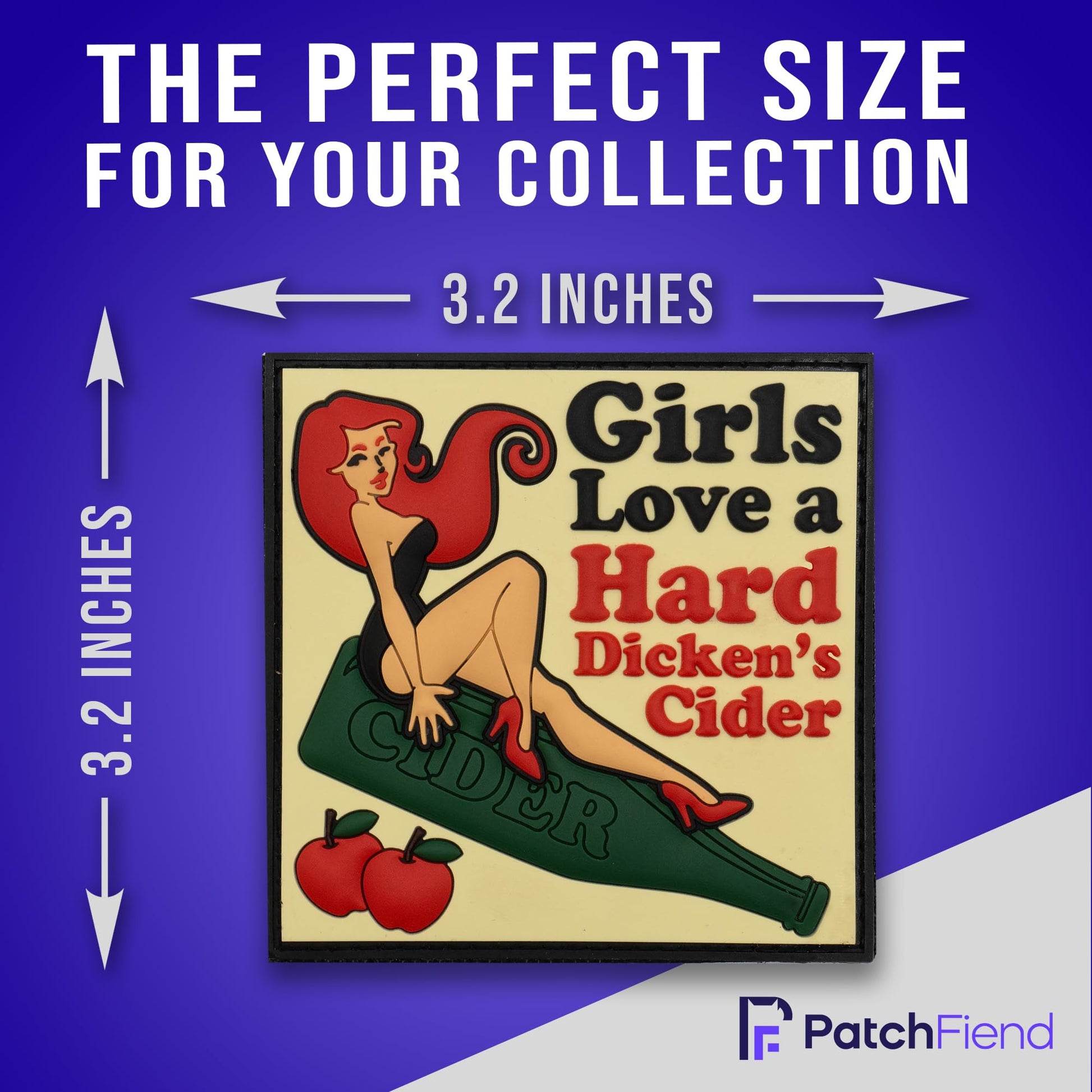 Details: Ah, the ever-subtle Dickins Cider patch. This delightful morale booster features a ravishing redhead retro-pinup perched atop a giant bottle of cider, clearly communicating her enduring love for the (in)famoous beverage. Now, some folks might misinterpret the inscription "Girls love a hard Dicken's Cider" as a testament to a woman's preference for, well, somethng we can't discuss here... But hey, that's just Freud whispering in your ear. Here at Dicken's Cider, we like to keep things clear and refreshing, just like our delicious hard cider! But seriously, this patch is a hilarious way to show your love for the brand (or your love of puns). Just be prepared to answer a few confused questions about your affinity for "hard" things. What's more, our tactical patches make it easy to attach this hilarious tactical patch to anything – from your tactical bag to your military backpack. And for the airsoft or paintball enthusiasts out there, our patches are perfect for adding a touch of humor to your gear. These tactical patches aren't just funny, they're also top-notch quality. Made from durable PVC, these patches can withstand the rigors of military life, or just everyday wear and tear. Puns aside, we take our patches seriously. It's not just a tactical patch, it's a conversation starter. Choose from our selection of moral patch funny patches, tactical patches, morale patches, and more. Wear this patch on your jackets, or even on your service dog's harness. With patches for backpacks and jackets, you can easily customize your gear to fit your style. Whether you're a seasoned morale patch collector, a military enthusiast, pinup lover, or just someone who appreciates a good joke, our Dicken's Cider' patch is the perfect addition to your collection. So why not add a little humor to your tactical gear, military backpack, or airsoft patches? You'll have everyone in stitches!