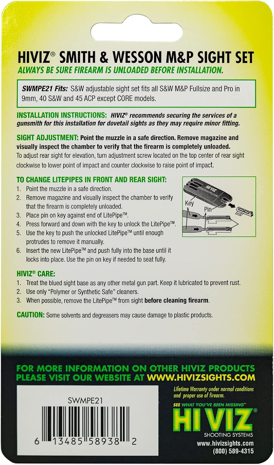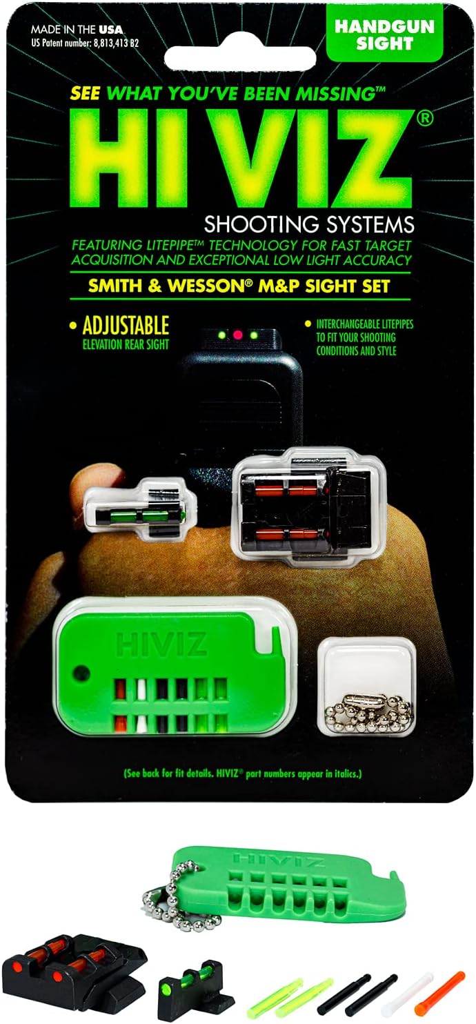 Improve the performance of your S&W M&P with the hiviz adjustable sight set. The bright and ultra-durable hiviz sights will enhance your confidence and shooting experience. Features: - hiviz interchangeable LitePipe design - all steel construction - elevation adjustable rear sight. Includes: - green, Red and white LitePipes. Specifications: - fits: M&P fullsize and long slide models except core - replacement LitePipe handgun version # 5, handgun rear LitePipe - LitePipe diameter, front sight 0.090, rear sight 0.078