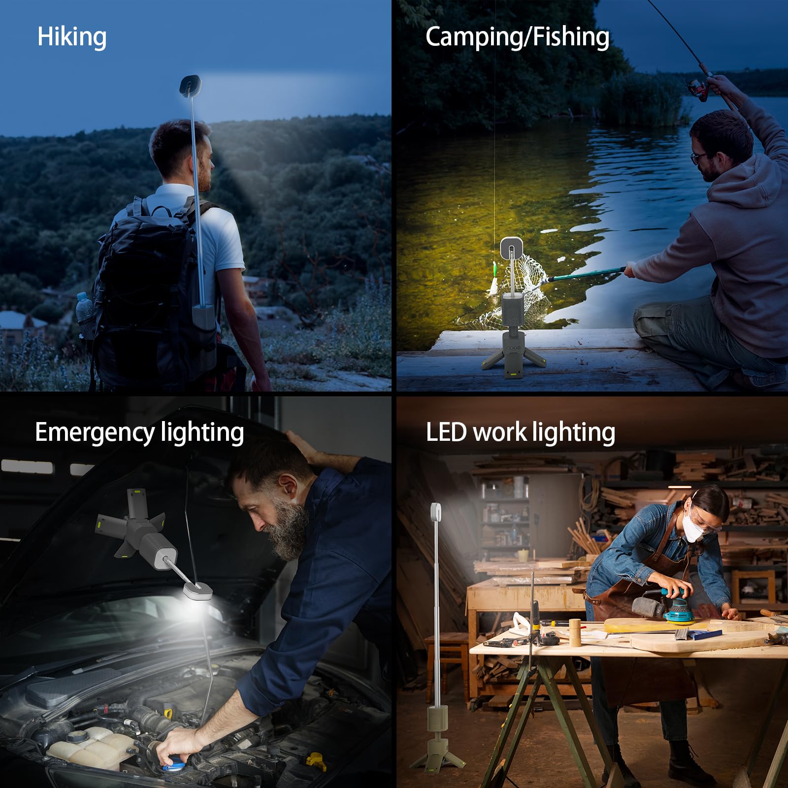 - 【Telescopic & Magnetic Design】Hiwevvy portable telescopic camping lantern with a retractable pole and collapsible magnetic quadripod. Extend it up to 102cm for broader illumination or collapse it down for easy storage and carry. The top lamp head can be rotated 180° to meet multi angles lighting needs. The stand base with strong magnetic can securely attaches to your vehicle to providing hands-free lighting convenience.