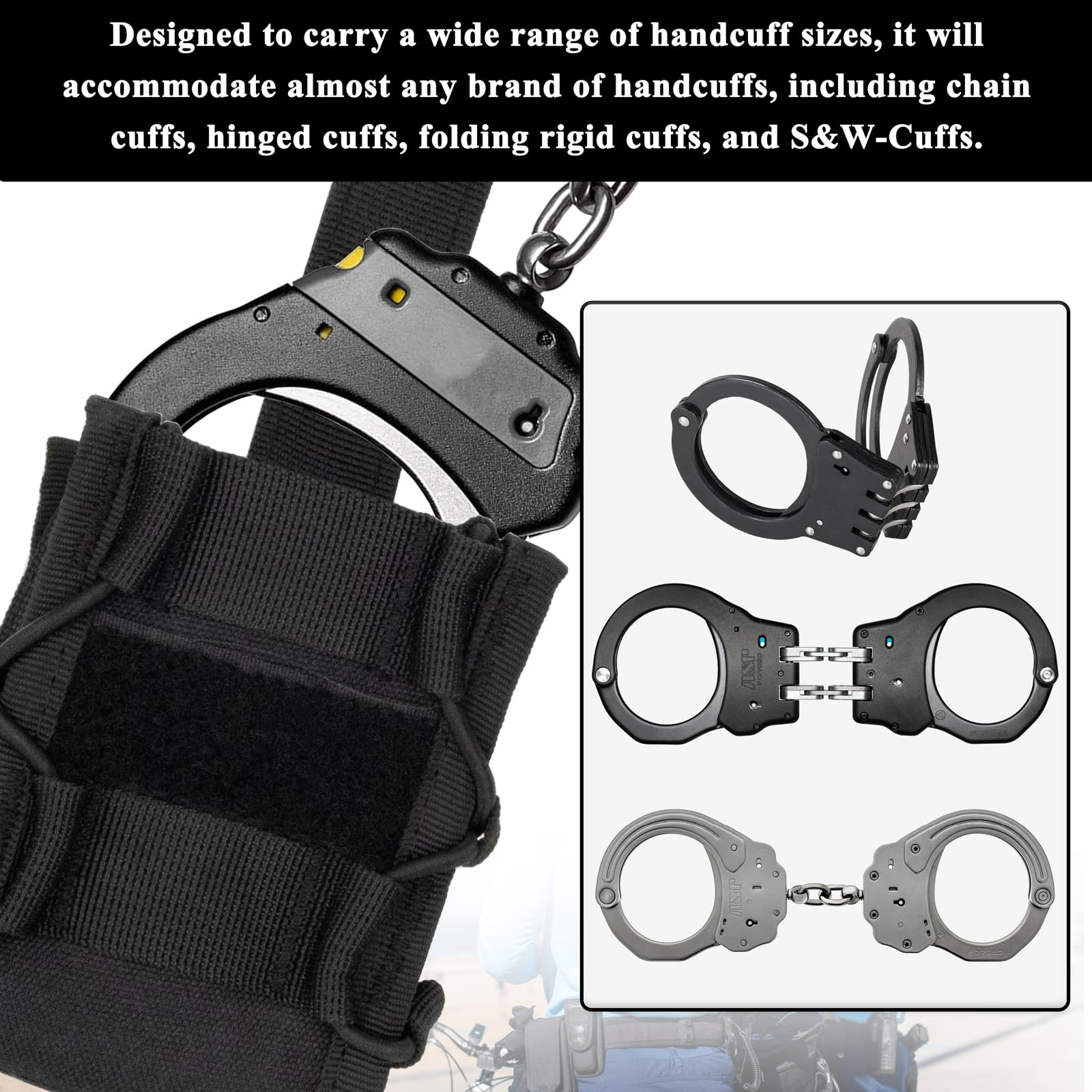 Compatible with most brand of handcuffs, including chain cuffs, hinged cuffs, folding rigid cuffs, and S&W-Cuffs. Fit for most MOLLE tactical vests and work belts.