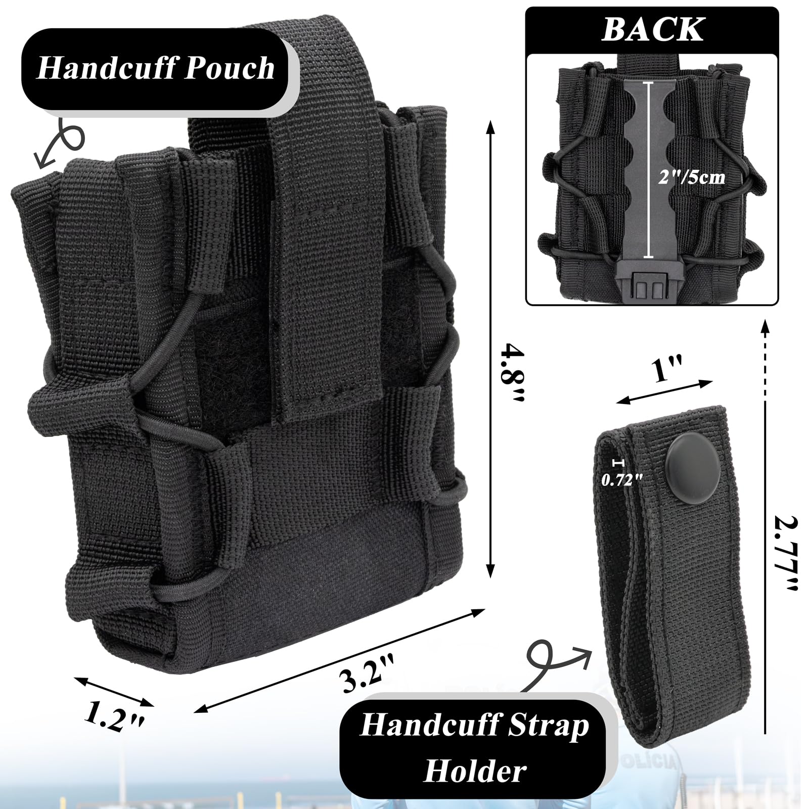 - 【Size Information】Handcuff Pouch - 4.8" x 3.2" x 1.2" with an adjustable elastic cord to hold different sized handcuffs while ensuring stability and providing shock absorption. Handcuff Strap Holder - 2.77" x 1" x 0.72", can be attached to a belt or bag and fits duty belts up to 2"/5cm wide.