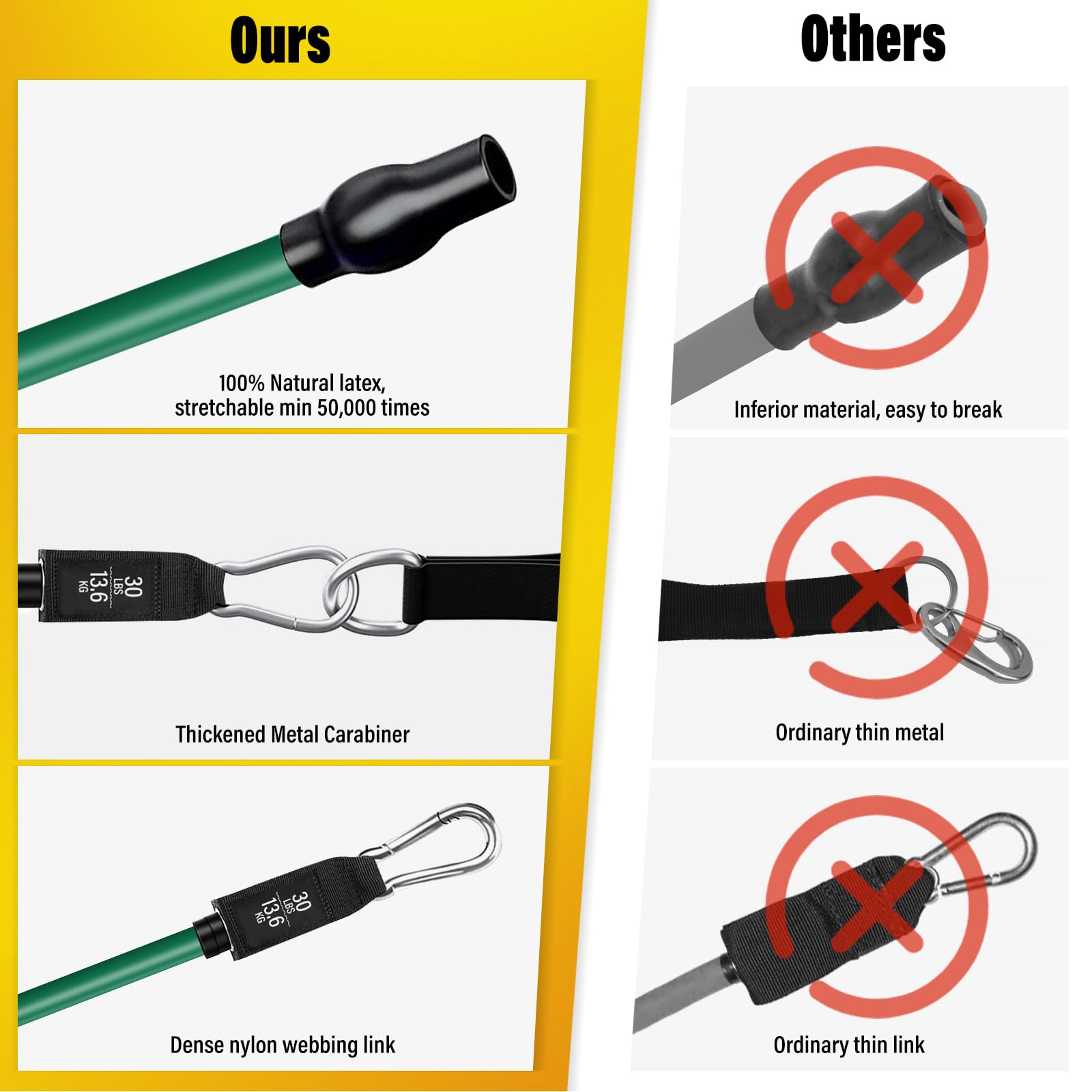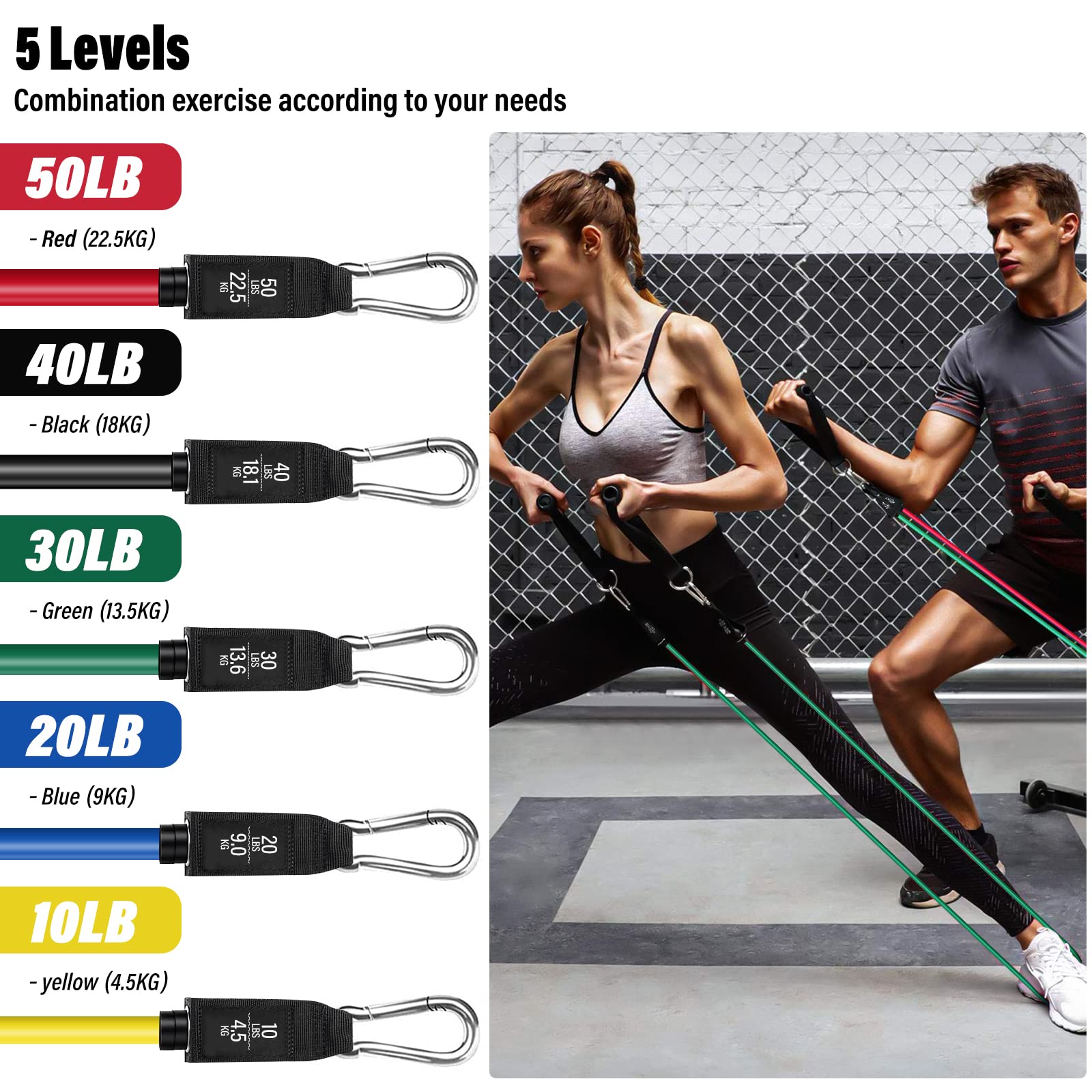 - Adjustable Resistance Bands: Achieve a maximum resistance of 150 lbs with this set of 5 durable, 48-inch colored bands: Yellow (10 lbs), Blue (20 lbs), Green (30 lbs), Black (40 lbs), and Red (50 lbs). Use individually or combine for customized resistance