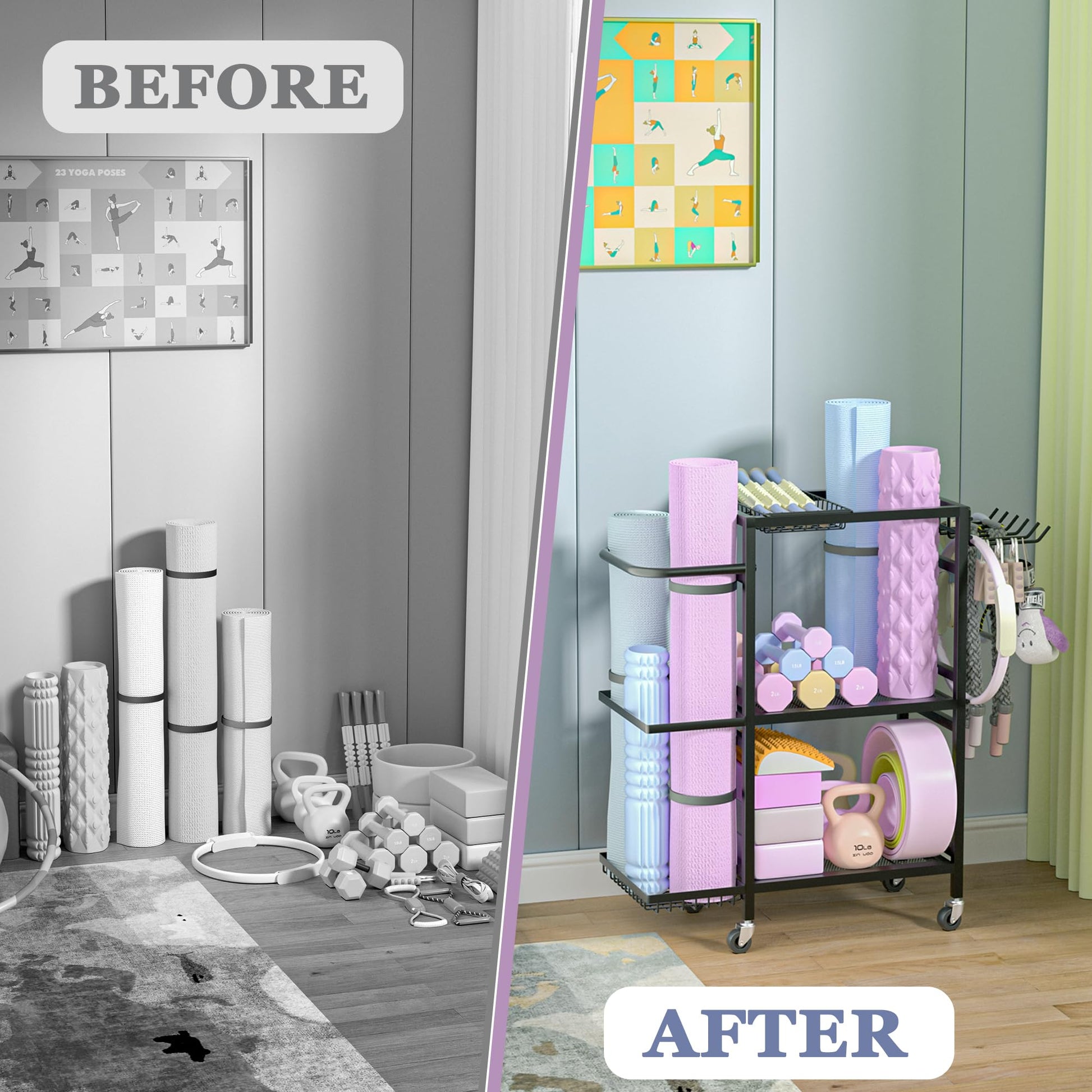 - 【Exercise Equipment Organizer】This exercise equipment organizer is perfect for organizing fitness equipment in home gyms, yoga studios and garages. Such as yoga mats, foam rollers, yoga blocks, yoga wheels, dumbbells, kettlebells, resistance bands and more.