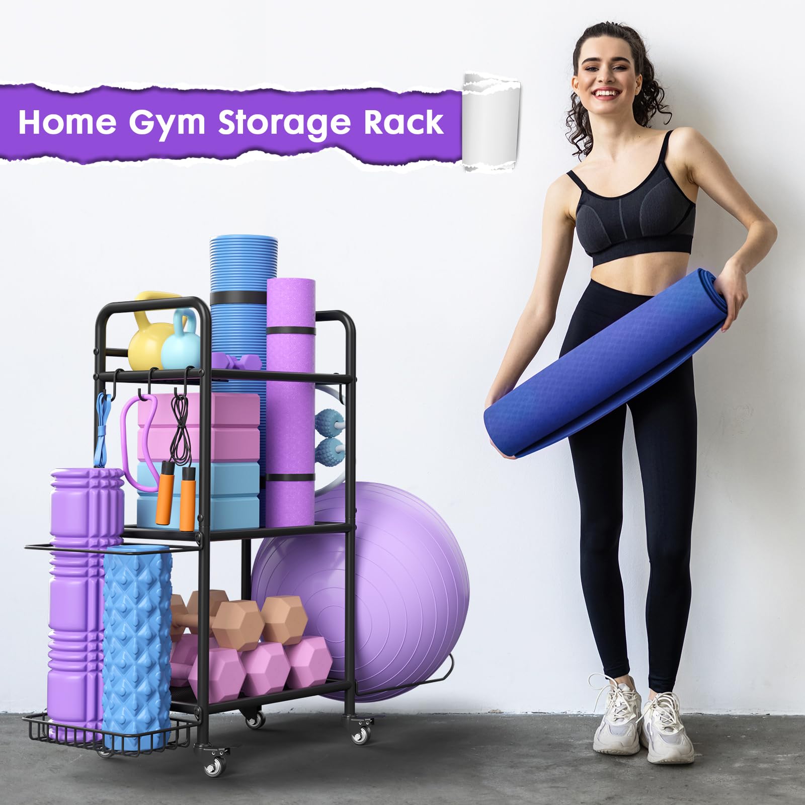 - [Smooth 360° Mobility with Lockable Wheels] Easily move this exercise equipment storage unit around with 4 smooth-rolling wheels, 2 of which can be locked for stability. Whether you’re shifting your yoga mat holder in a small room or relocating equipment within your gym, this rack offers seamless maneuverability. Keep your yoga mat holder and gym accessories within reach wherever you train.