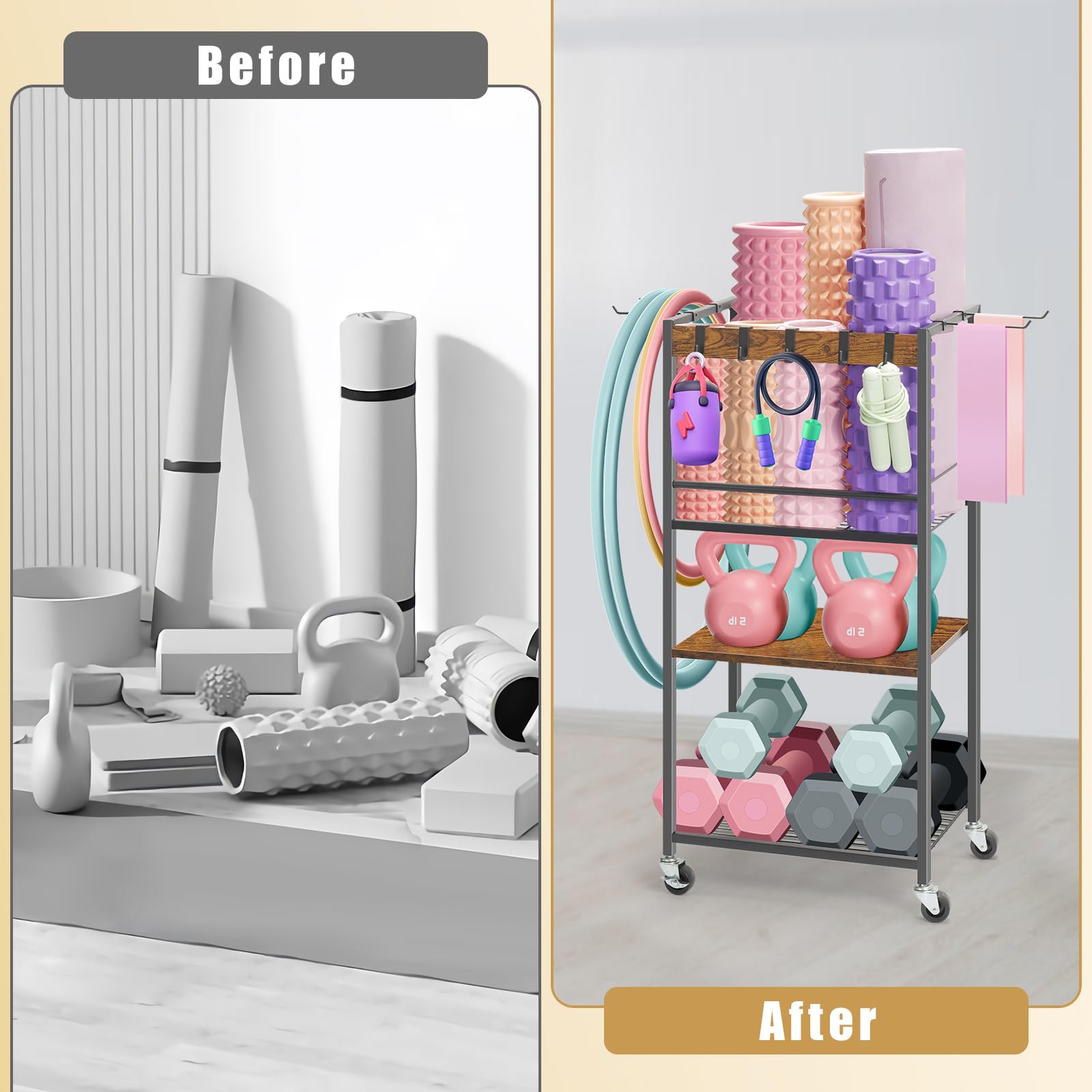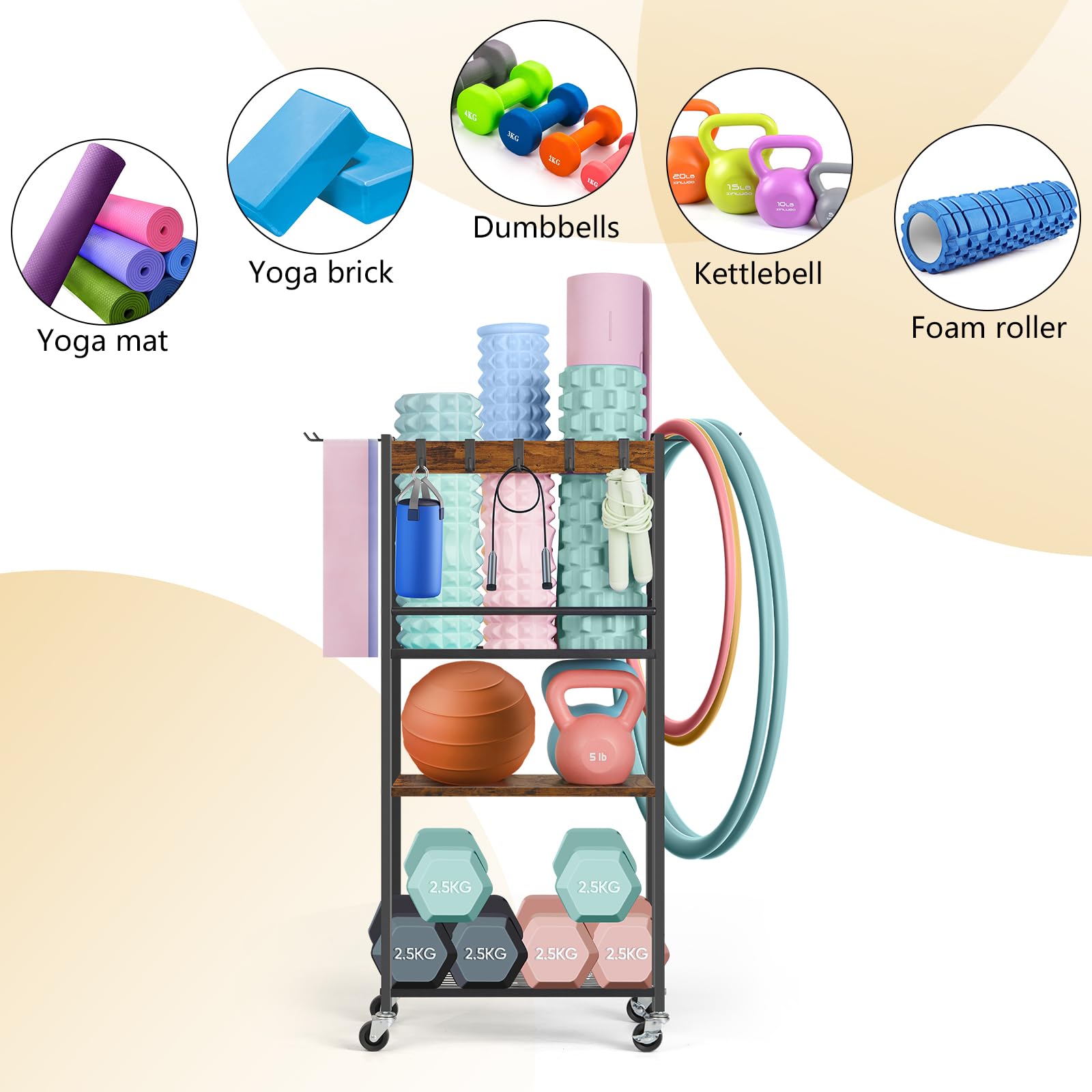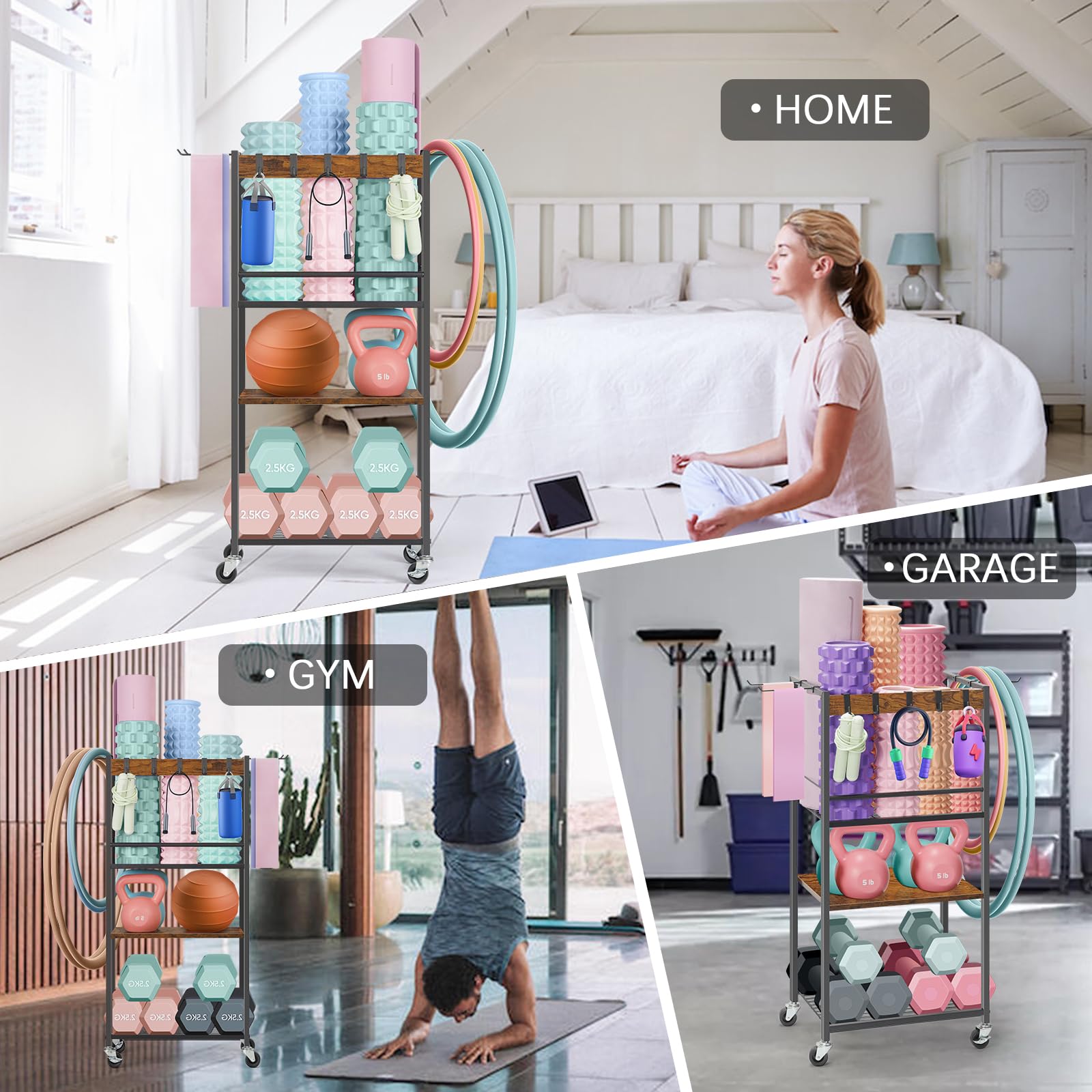 Home Gym Storage Rack, Yoga Mat Storage Racks, Workout Equipment Storage Organizer for Dumbbell Kettlebells, Exercise Shelf with Hooks and Wheels(Rustic Brown)