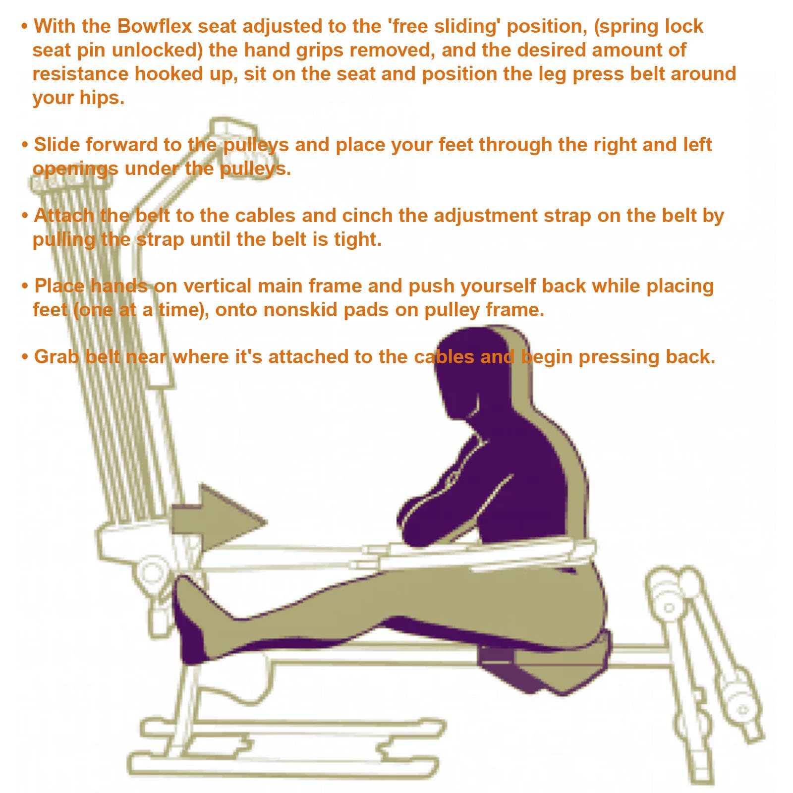 - Instructions: Adjust the seat to the "free sliding" position by unlocking the spring lock seat pin. Remove the hand grips and attach the desired amount of resistance. Sit on the seat and position the leg press belt around your hips.