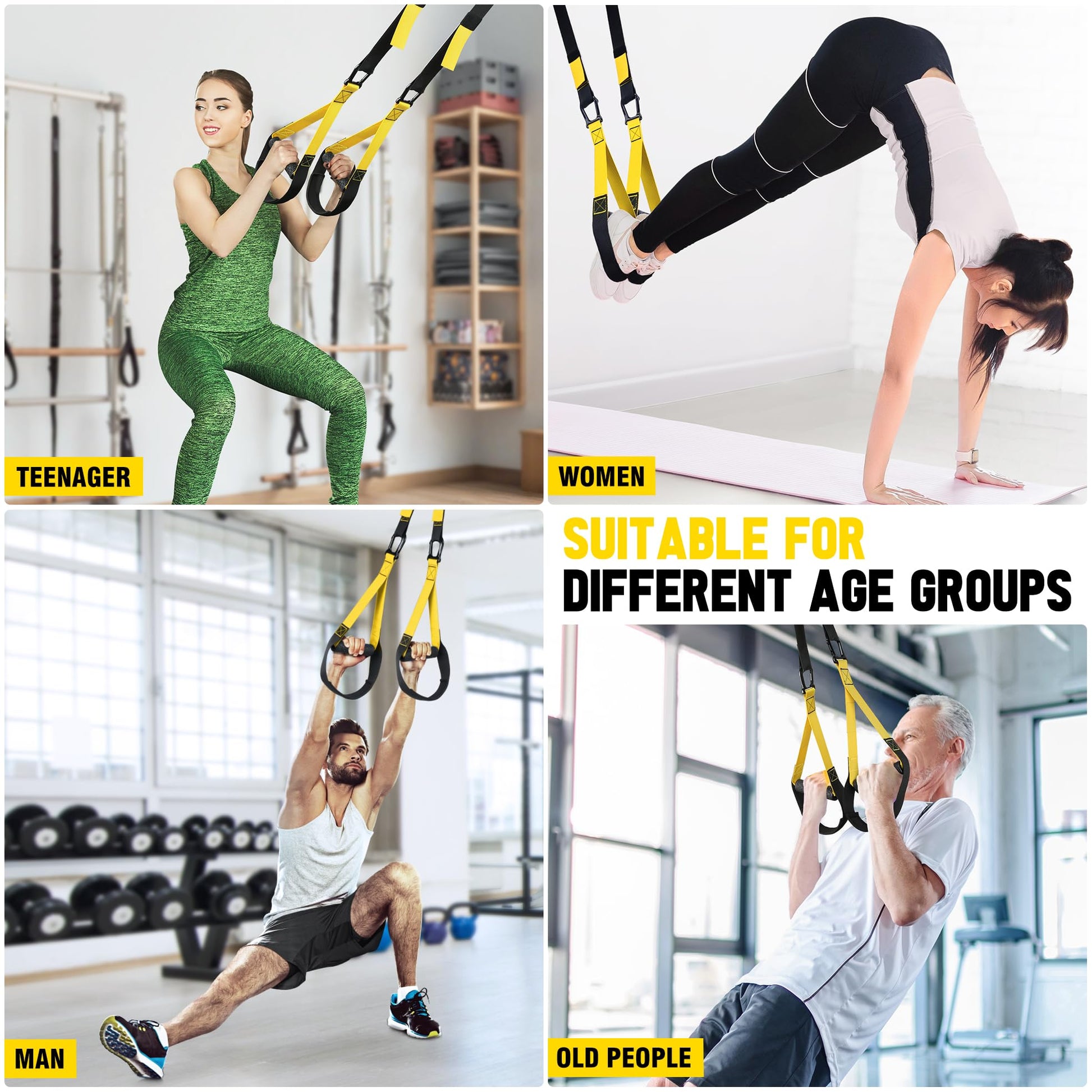 - 【Awsome Multifunctionality】Resistance trainer straps are suitable for all levels and all fitness goals, by practice and mastering many simple basic movements, like push, pull, plank, squat, lunge, hinge & rotate. The bodyweight resistance straps trainer can provide great versatility for your home gyms, garage, training studios, physical therapy centers and various workout environments.