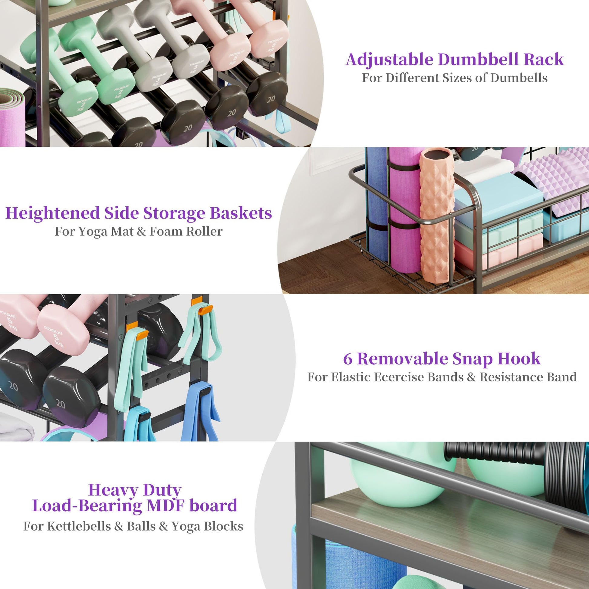 - ALL-IN-ONE HOME GYM STORAGE RACK: This weight storage racks is equipped with top plank layer for storing kettlebells, 2-layer dumbbell rack,a side basket for storing yoga mat and foam rollers, 6 side hooks for fitness resistance band,bottom storage rack is perfect for storing balls, yoga blocks and other exercise equipment.Perfect for organizing your various gym equipment into one storage rack, easy to save your space and stay organized