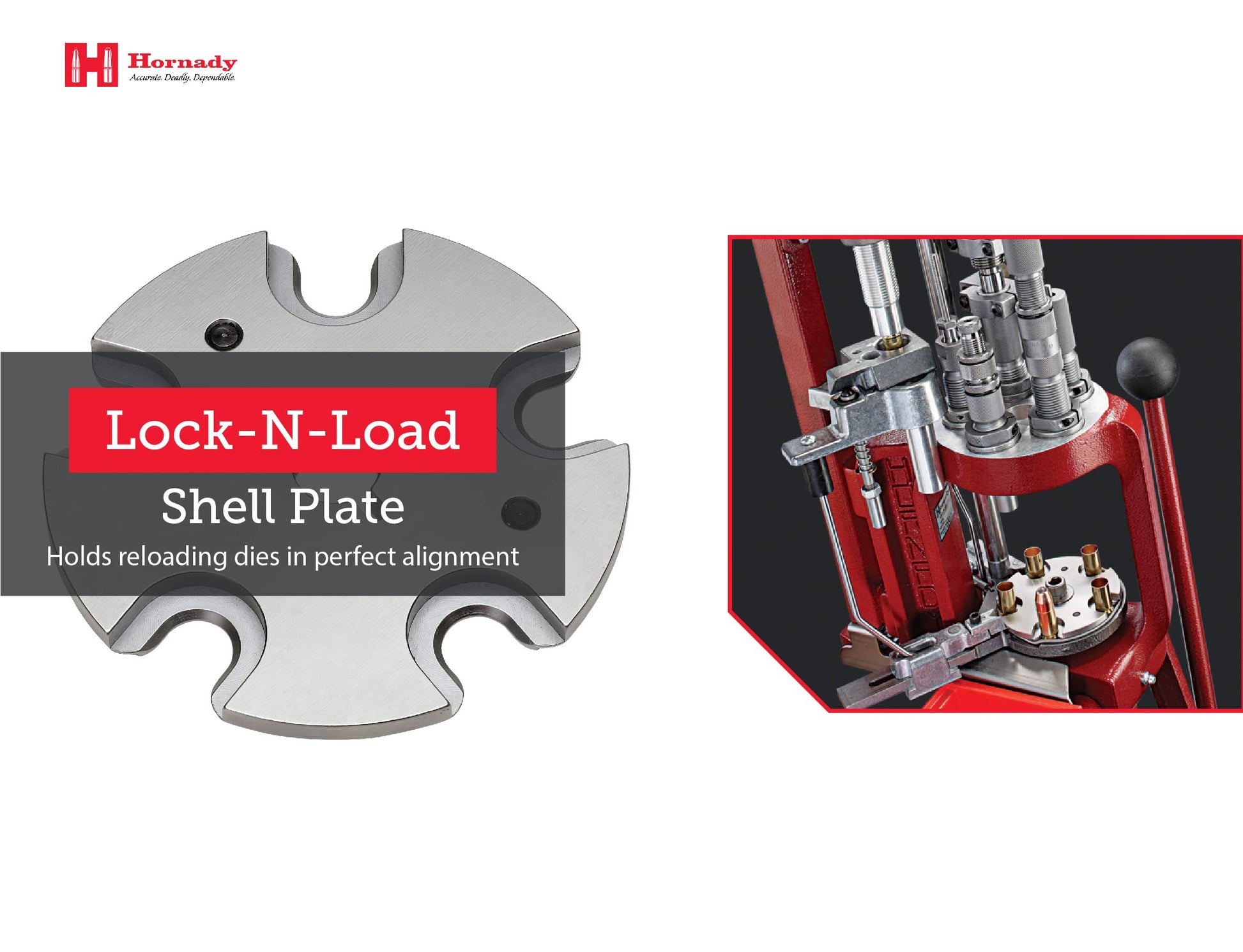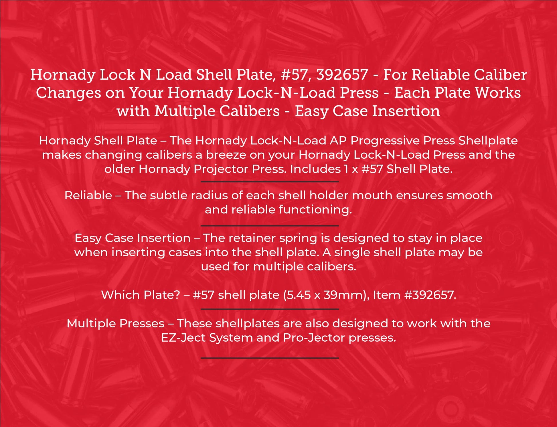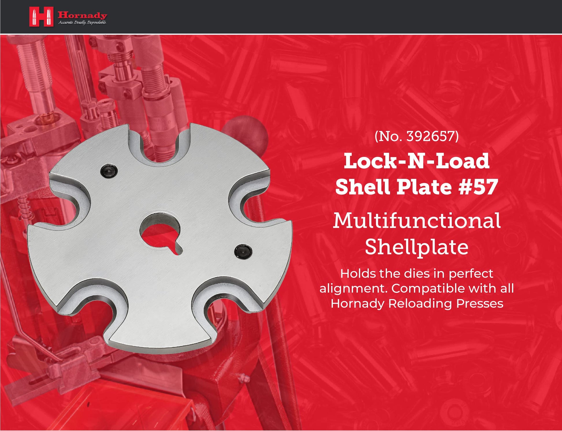 - Hornady Shell Plate – The Hornady Lock-N-Load AP Progressive Press Shellplate makes changing calibers a breeze on your Hornady Lock-N-Load Press and the older Hornady Projector Press. Includes 1 x #57 Shell Plate