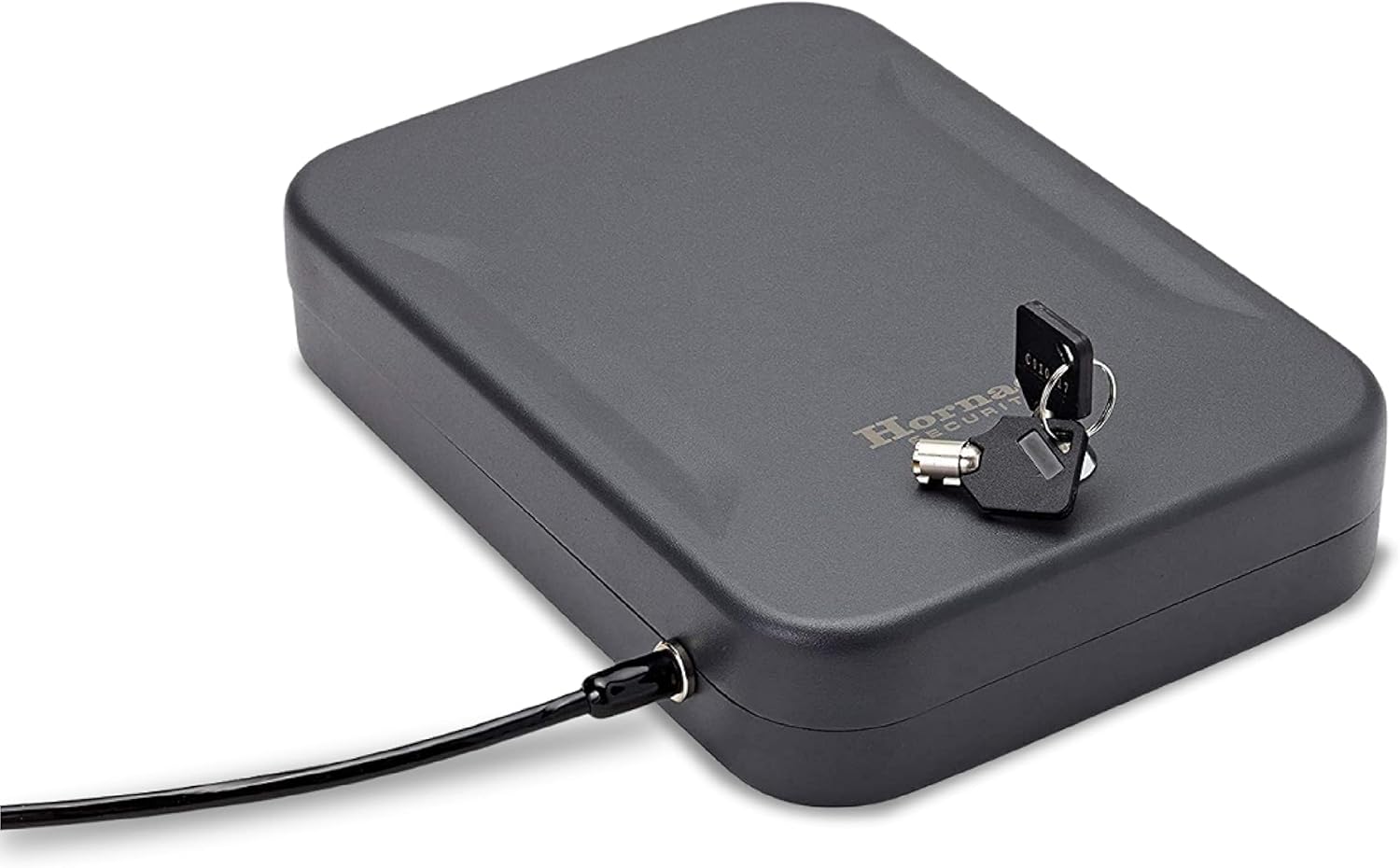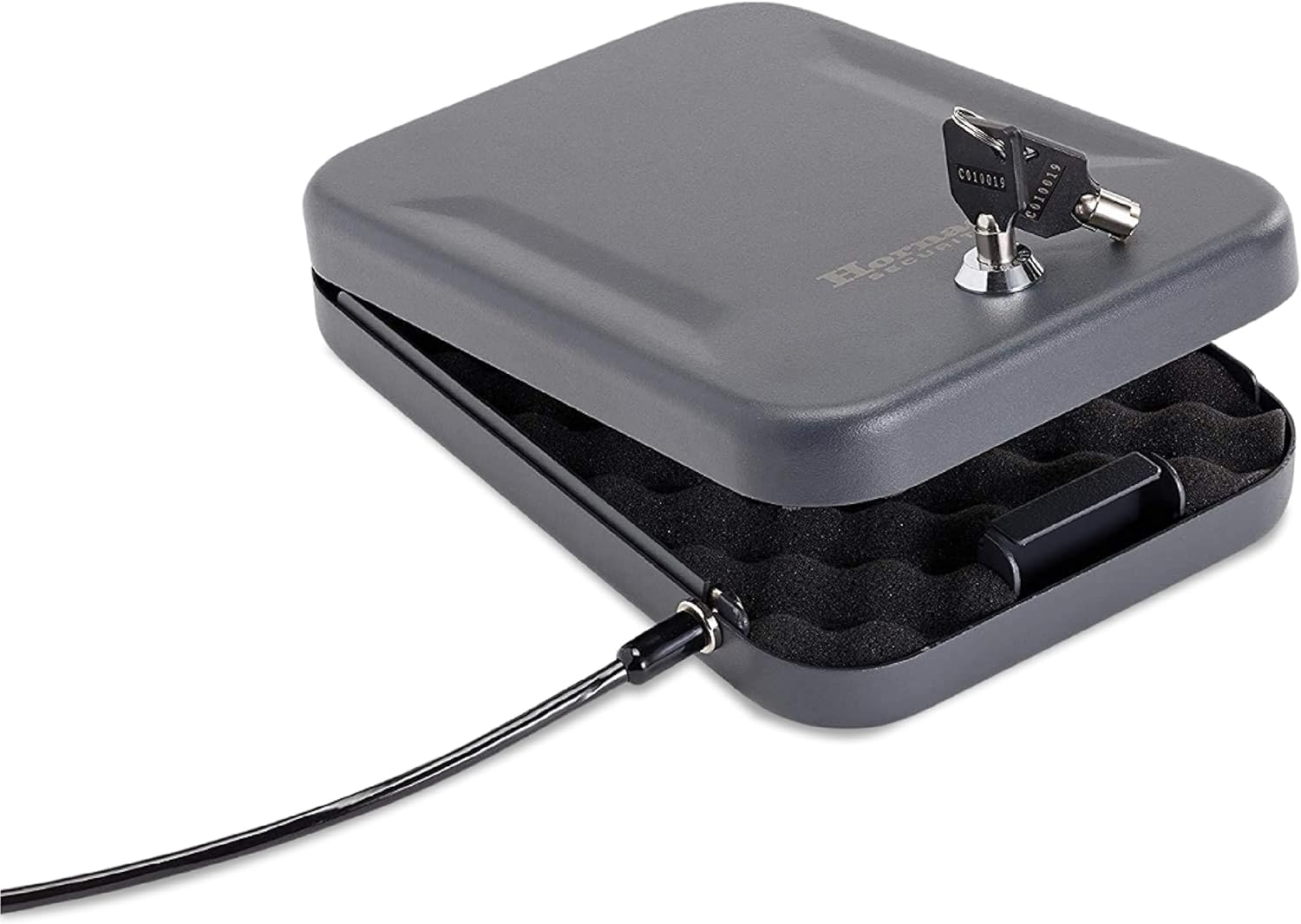 - Heavy and Sturdy – This Hornady safe is made from 16 gauge steel. Comes with a heavy duty 1500 lb. steel lock-down cable that attaches the portable safe to any stationary object, including a vehicle seat or heavy piece of furniture
