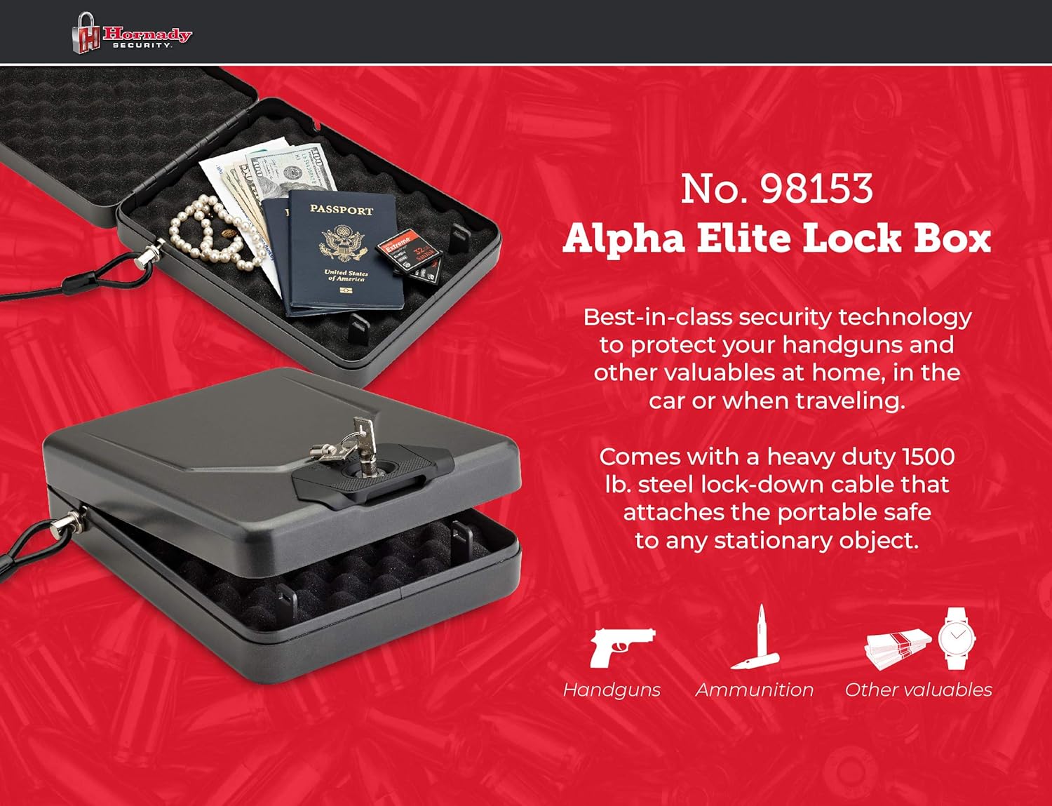 - Hornady Lock Box – Store your firearm and valuables with confidence. This large locked storage box provides a safe and secure place for your handguns and other valuables at home, in the car or when traveling