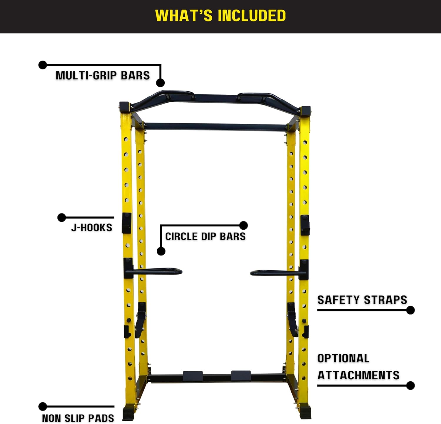 - The squat rack package includes (1) Pro Series Power Cage/Squat Rack, (2) Circle Dip Bars, (1) Multi-grip Pull Up Bar, (2) Safety Bars with J-hooks or (2) Safety Straps (2) J-hooks. Hardware and instructions are included.