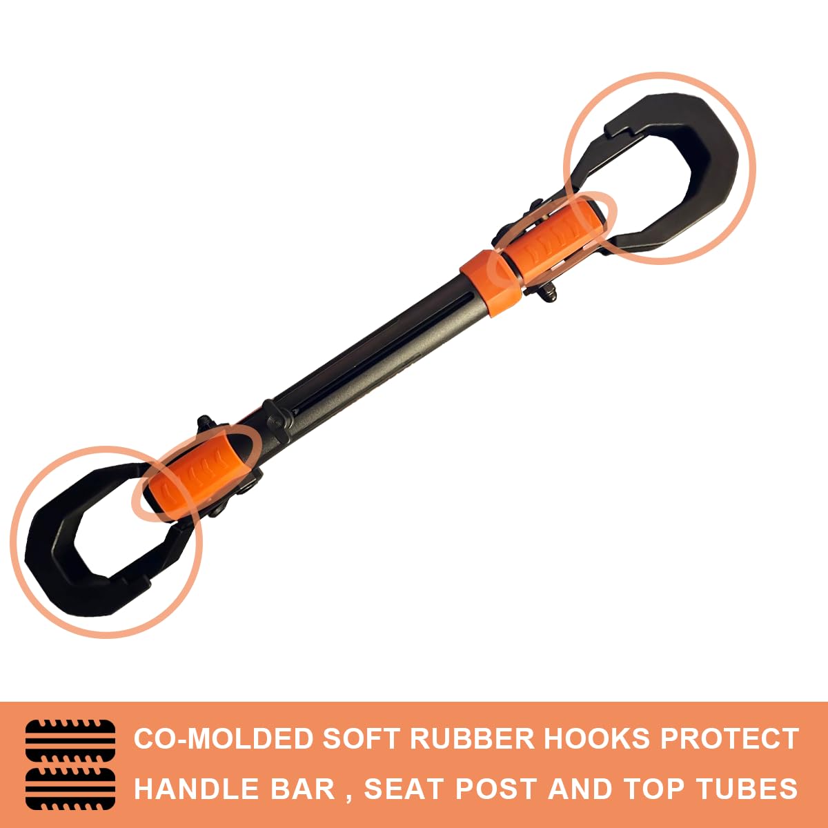- Co-molded soft rubber hooks protect the handlebar and seat stem.