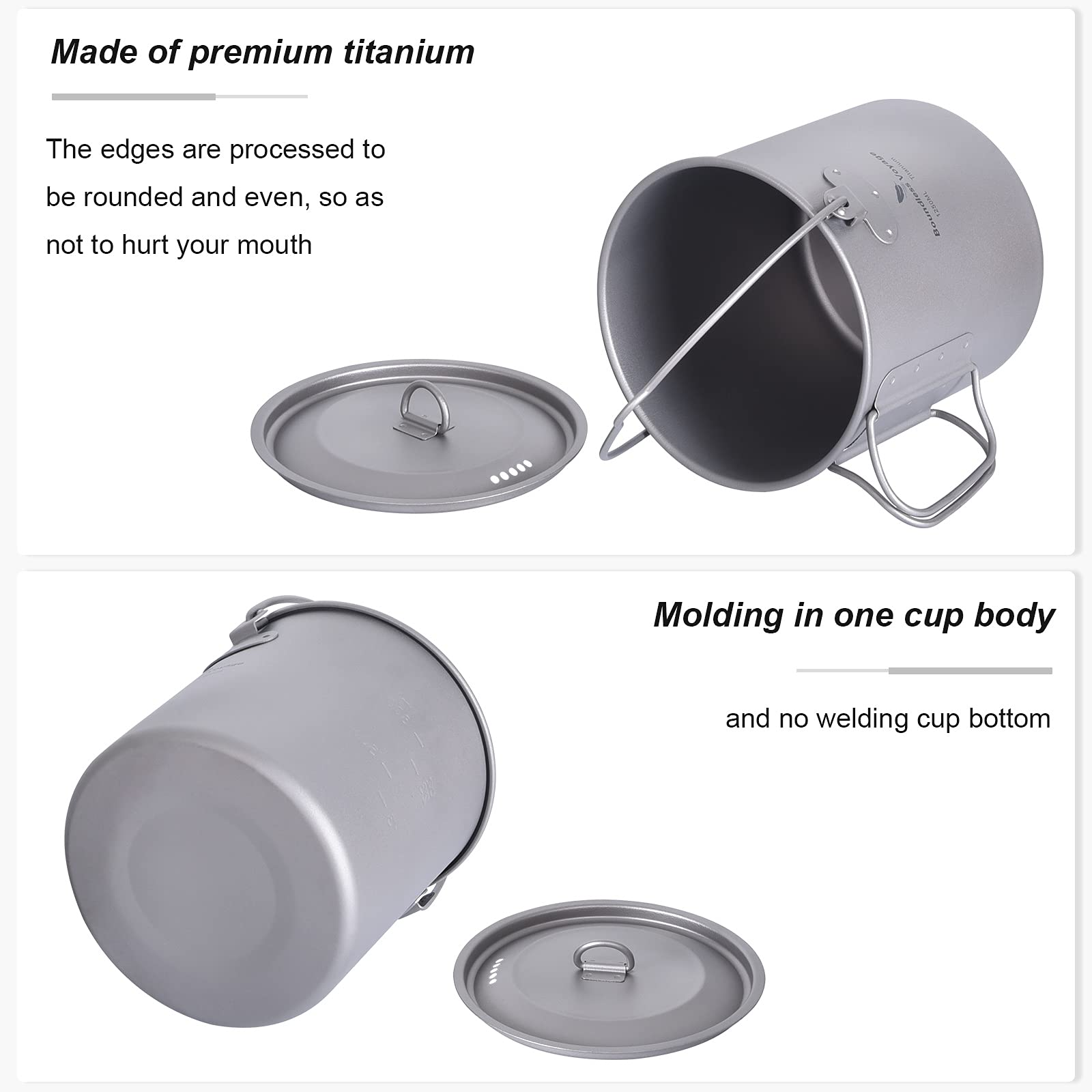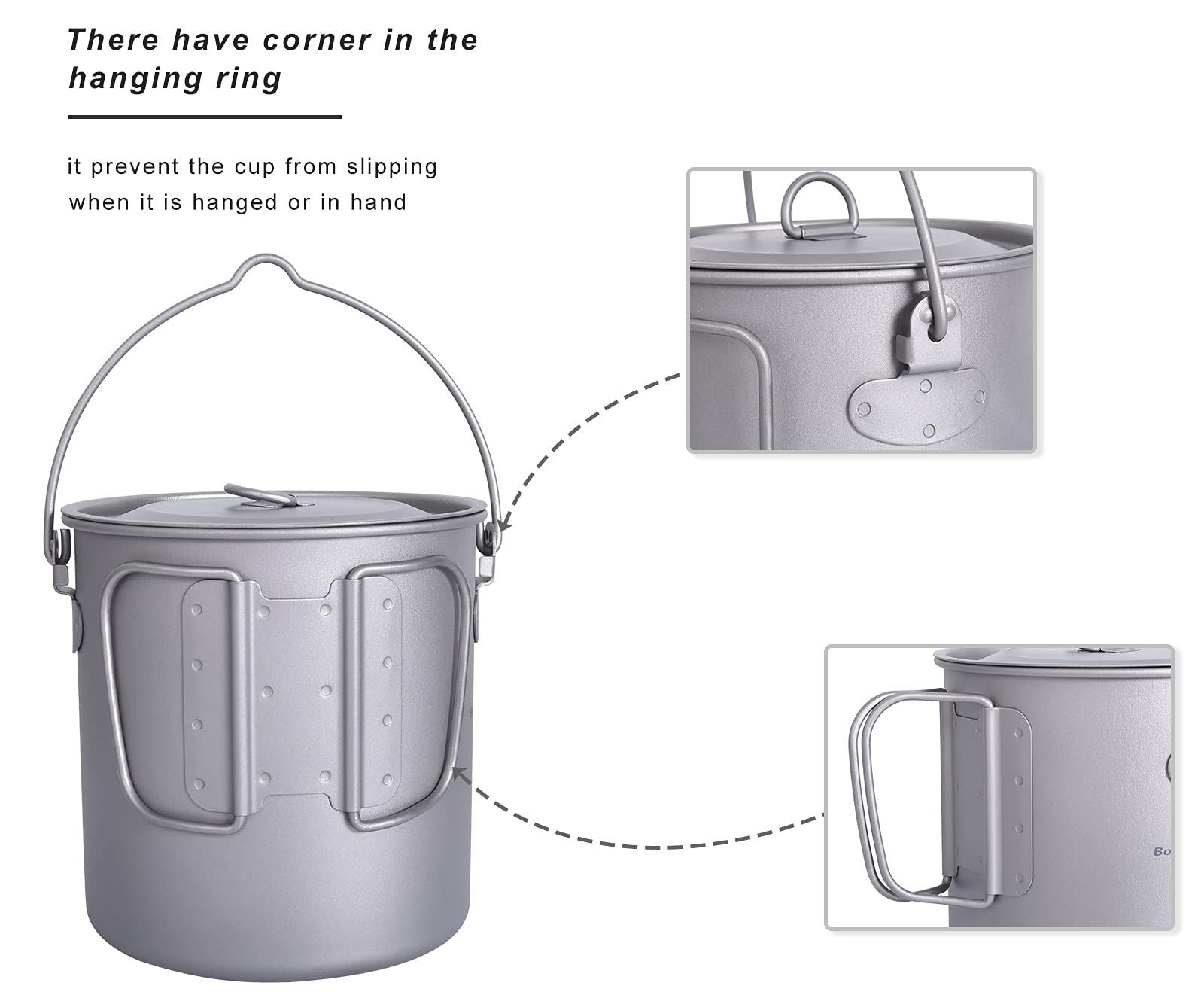 iBasingo 1250ml Titanium Hanging Mug with Lid Tea Coffee Water Cup Outdoor Camping Pot Ultra-light Portable Hiking Backpacking Cooking Kit Picnic Tableware Drinkware with Foldable Handle Ti3042D