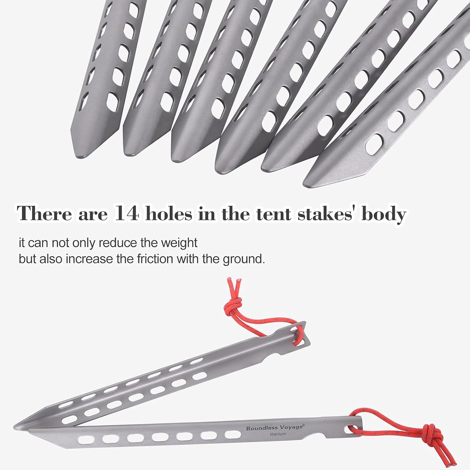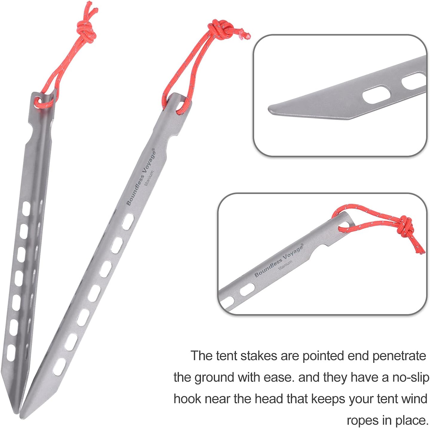 - ● Titanium tent stakes: Penetrate and hold firmly in a wide range of soil conditions.