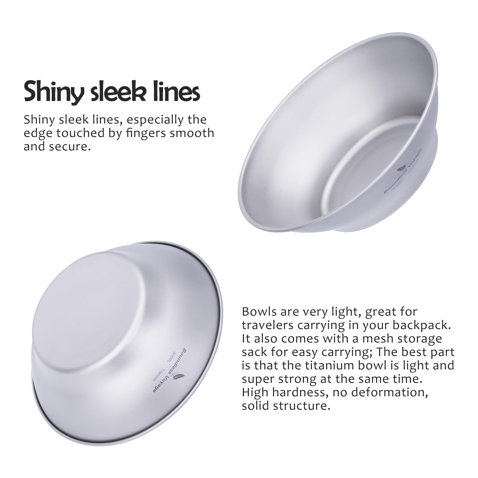 - Lightweight & Super strong: Bowls and Plates are very light, great for travelers carrying in your backpack. It also comes with a mesh storage sack for easy carrying; The best part is that the titanium bowl is light and super strong at the same time. High hardness, no deformation, solid structure.
