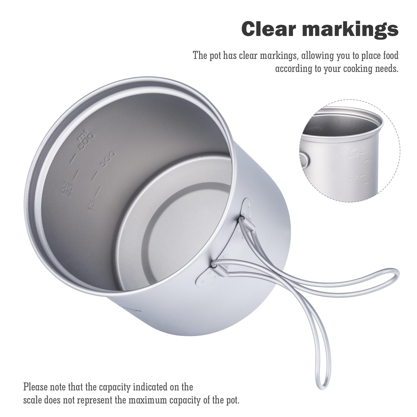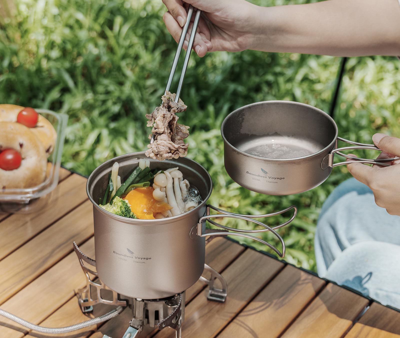 - Ultralight Titanium Camping Cookset (1000ml+500ml) - Perfect for 1-2 backpackers! Weighs just 181.5g with premium titanium construction - rustproof, odorless, and ultra-durable. The 1000ml pot handles main meals while the 500ml pot boils water. Compact nesting design saves space. Ideal for hiking, camping, and outdoor adventures.