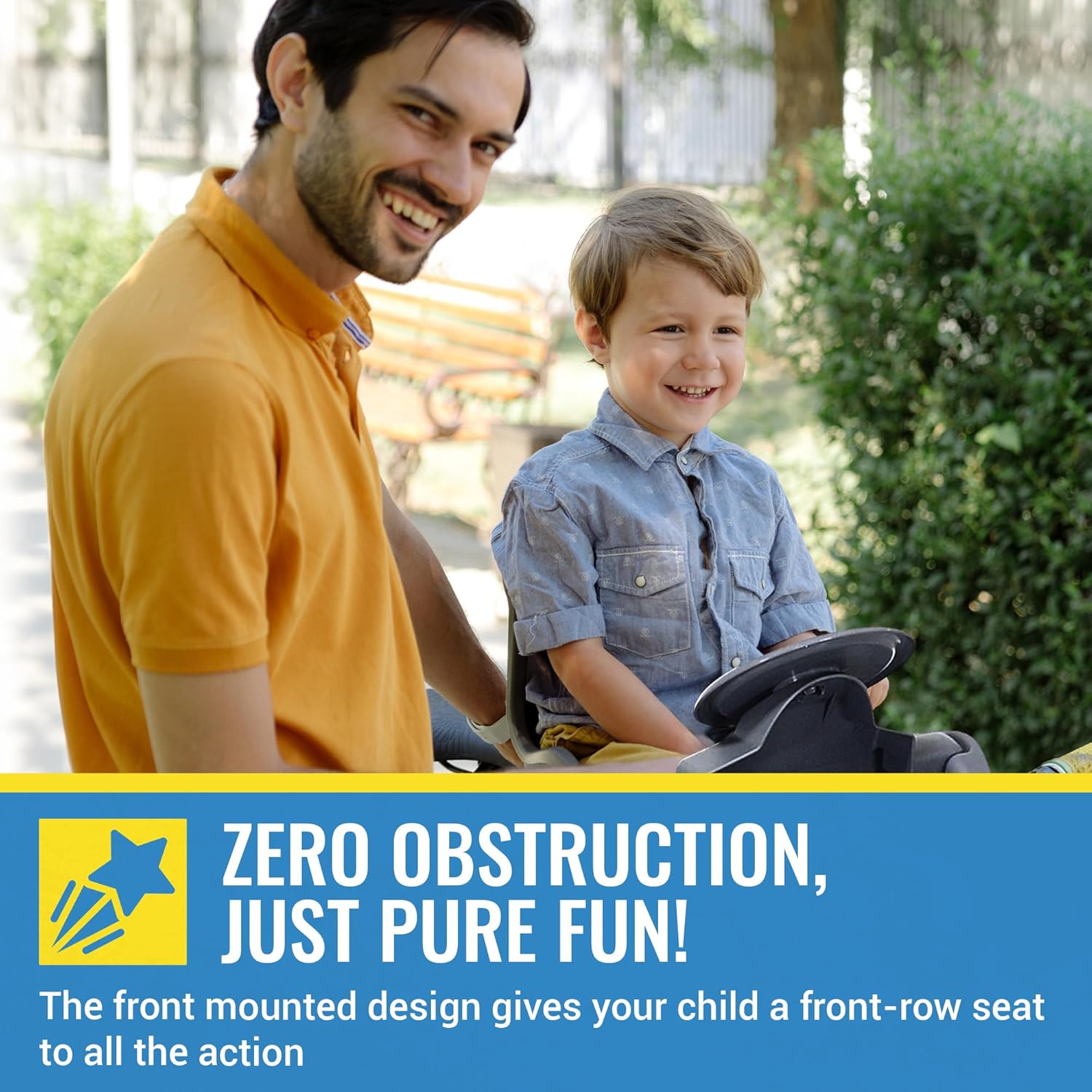 - Safety Conscious: This child seat for bikes comes equipped with an adjustable 3-point safety harness which secures your child firmly in the padded seat, preventing them from moving or falling out. The seat also includes a steering wheel dashboard for fun.