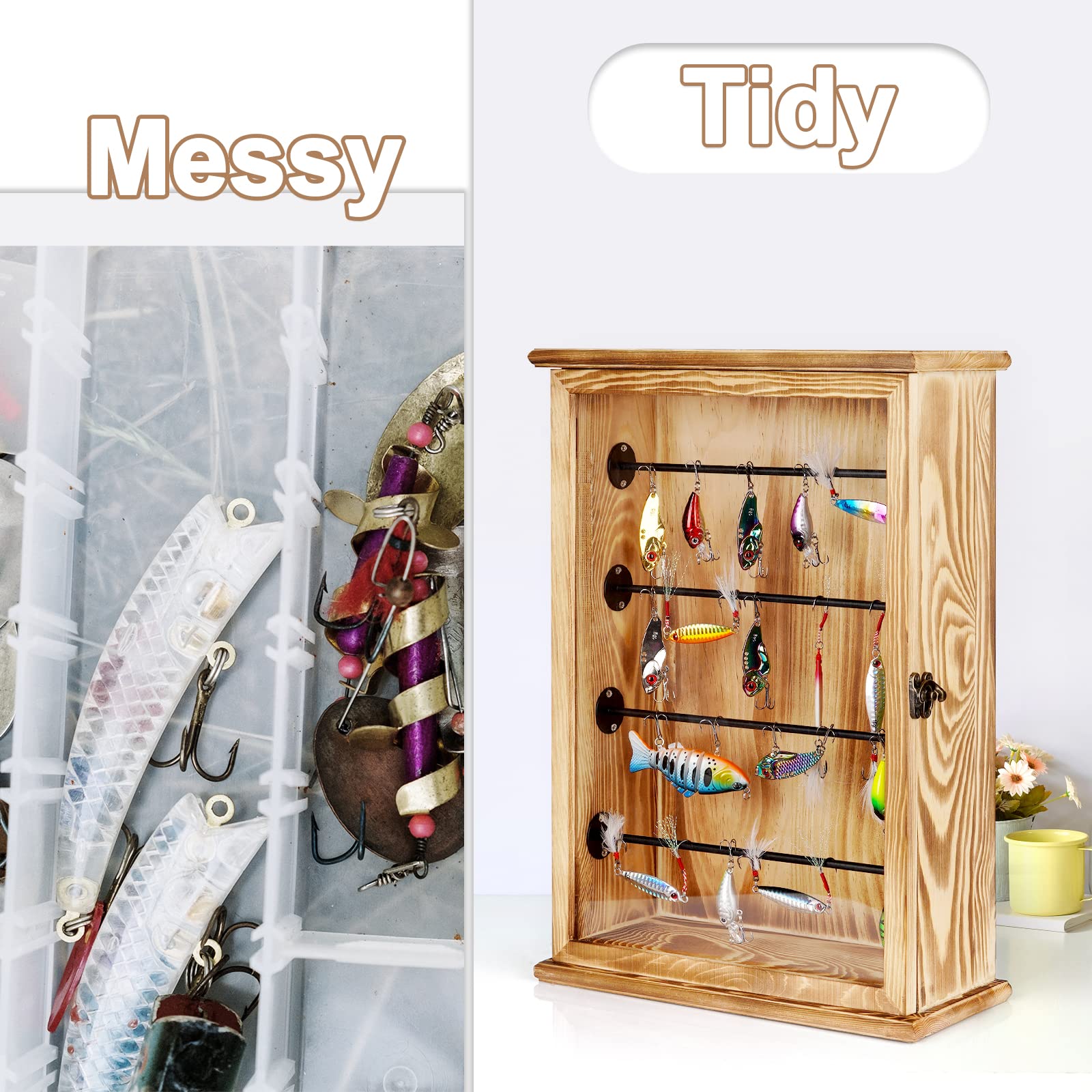 - 【High-Quality Materials】The fishing tackle box organizer comes with a solid and enduring wood frame and and 4 tier stepped metal shelves for hanging bait , and a clear acrylic doors, the display box is sturdy and enduring and help identify items quickly. Premium materials meet detail-oriented workmanship to create a fish bait box that lasts.