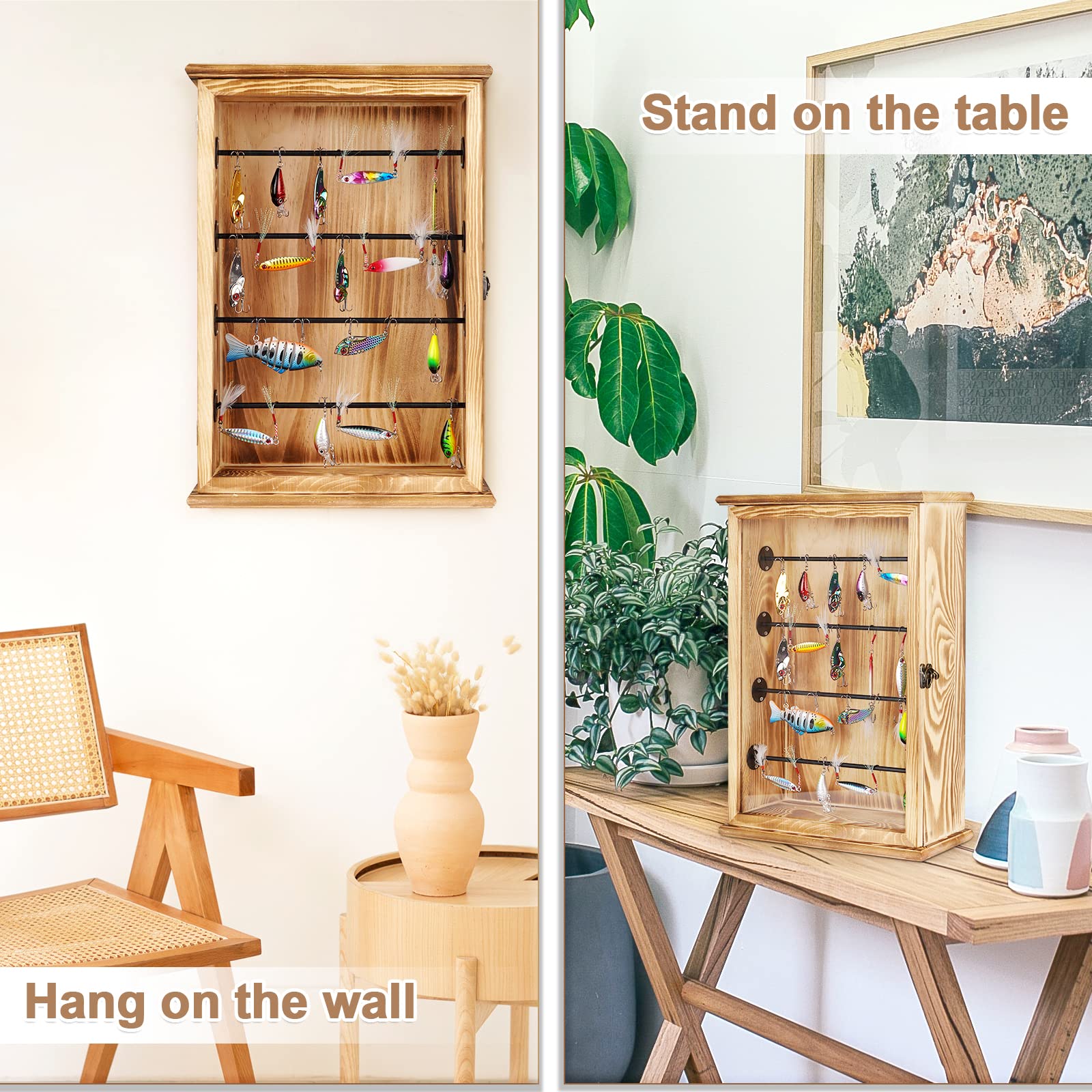 - 【Convenient and Stylish Design】This small fishing lure box requires no assembly and can be placed anywhere you need it, on a countertop or on a wall, for display and storage, clear and enduring, easy to find and change bait. Its wood vintage look complements any decor and can be used for study room, office, collection room, garage.