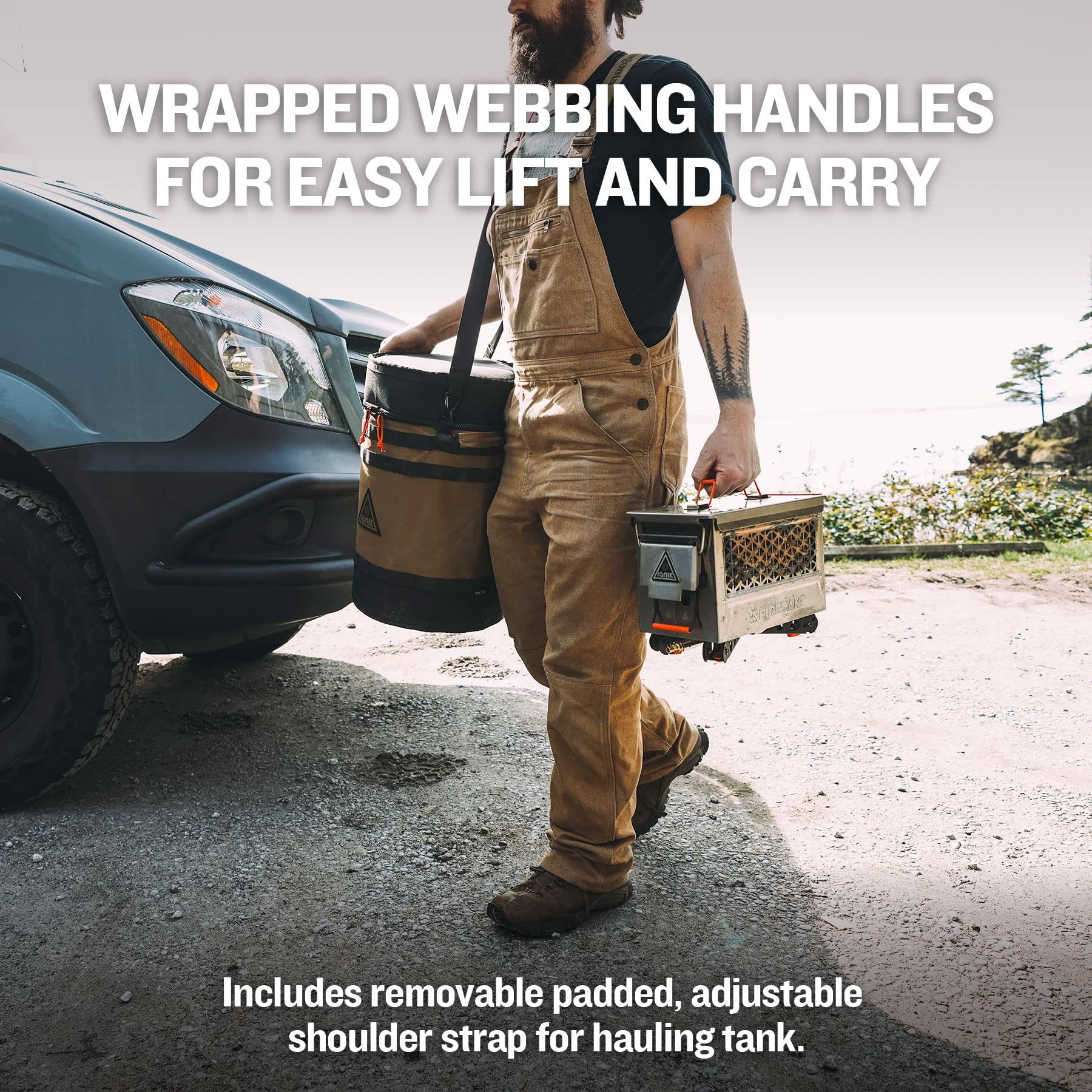 - Carrying case for a standard-size, refillable 20-pound propane tank (tank sold separately) with webbing handles for transporting heavy tanks, and a sturdy zipper top that functions as a seat or a table