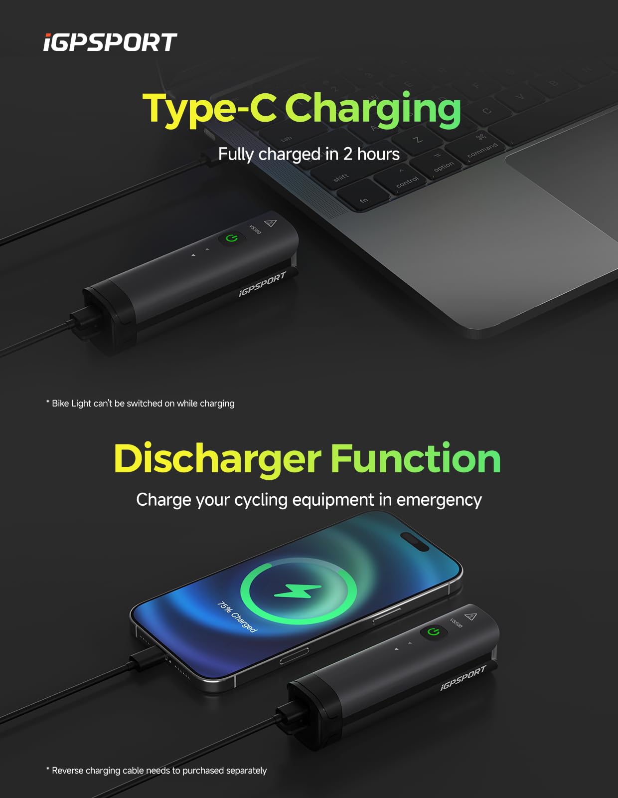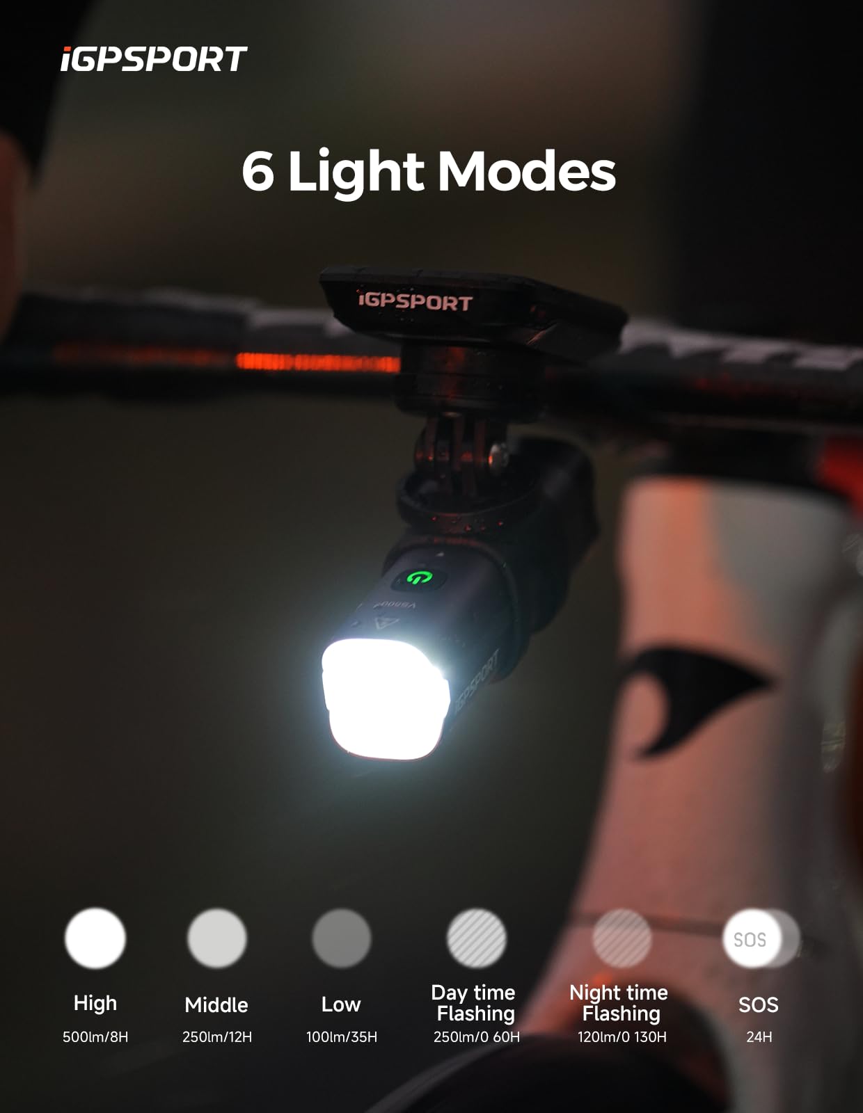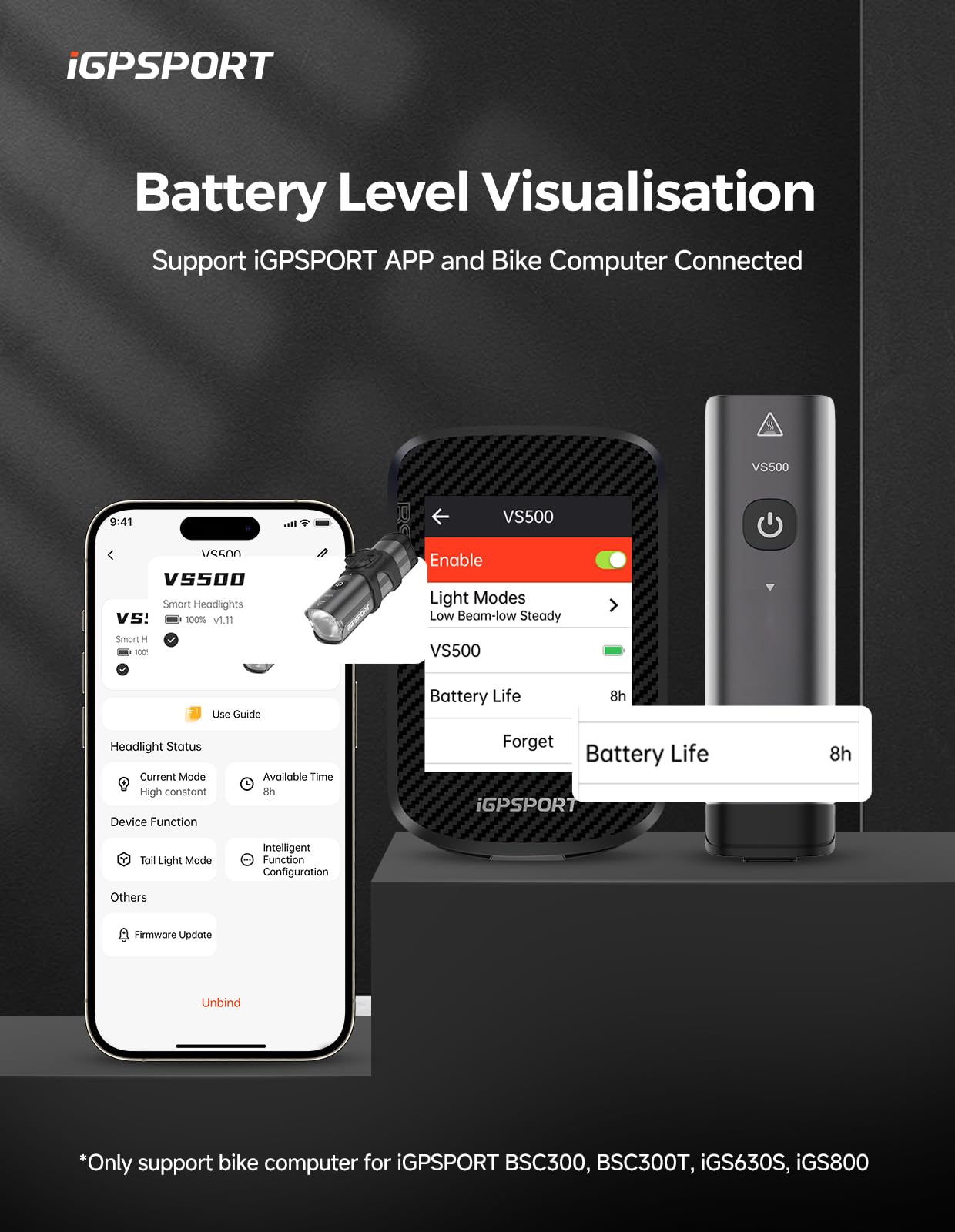 - 【Accurate Battery Level Display】VS500 bluetooth bike headlight can connect with your smart phone (official APP - iGPSPORT) or iGPSPORT bike computer, you can view battery level and battery life accurately in real time.