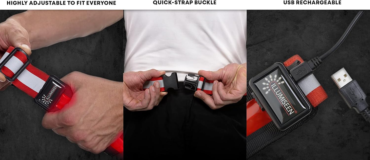ILLUMISEEN LED Reflective Belt Sash | High Visibility LED Lights with 2 Lighting Modes | Adjustable Quick Release Buckle | USB Rechargeable, No Batteries Needed | Weatherproof Professional Safety Gear