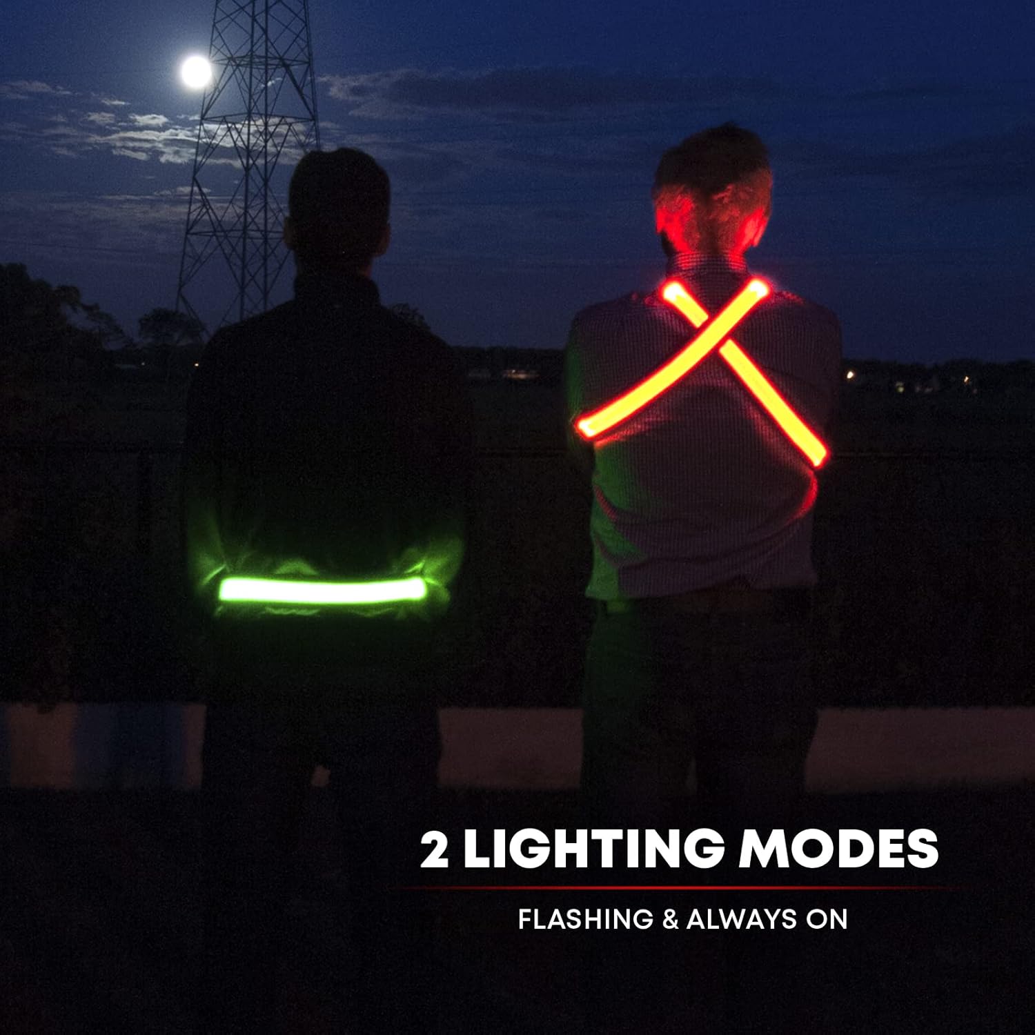 - 10X MORE VISIBLE THAN AN ALTERNATIVE SAFETY GEAR - The brightness is much higher than in the reflective gear because our LED reflective belt both reflects oncoming light and illuminates - which makes it one of the best safety accessories on the market. The cross-body design resembles warning and caution sign will make you visible even in adverse weather conditions. There is no way to overlook anyone wearing this. Vehicles will see you well in advance - ALL THE TIME