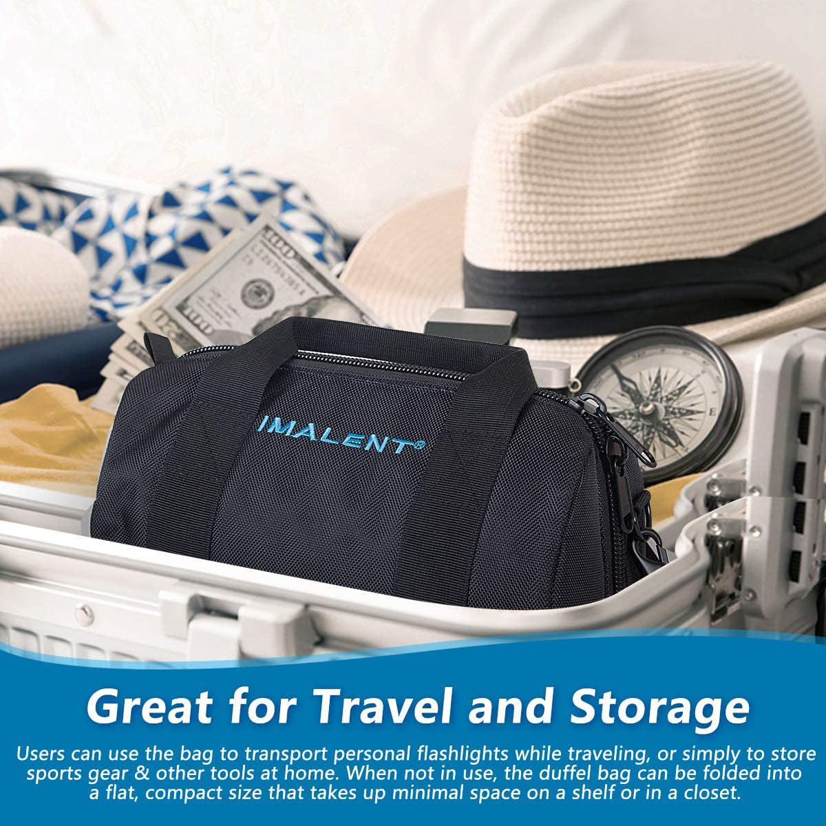 Details: This Imalent flashlight bag is made of superior durable nylon and water-resistant canvas for long-term use. The shoulder strap of the canvas messenger bag is detachable and can be adjusted at the most suitable length. Padded handle and strap are also helpful to ease your fatigue. Perfect for outdoor leisure, mountain climbing, travel, hiking, expedition, fishing, bicycling, hunting, and so on. Two-way zipper: It's more convenient for you to use it. The Imalent flashlight bag Dimensions Approx: 11.2"L x 8.8"H x 7.01"W.