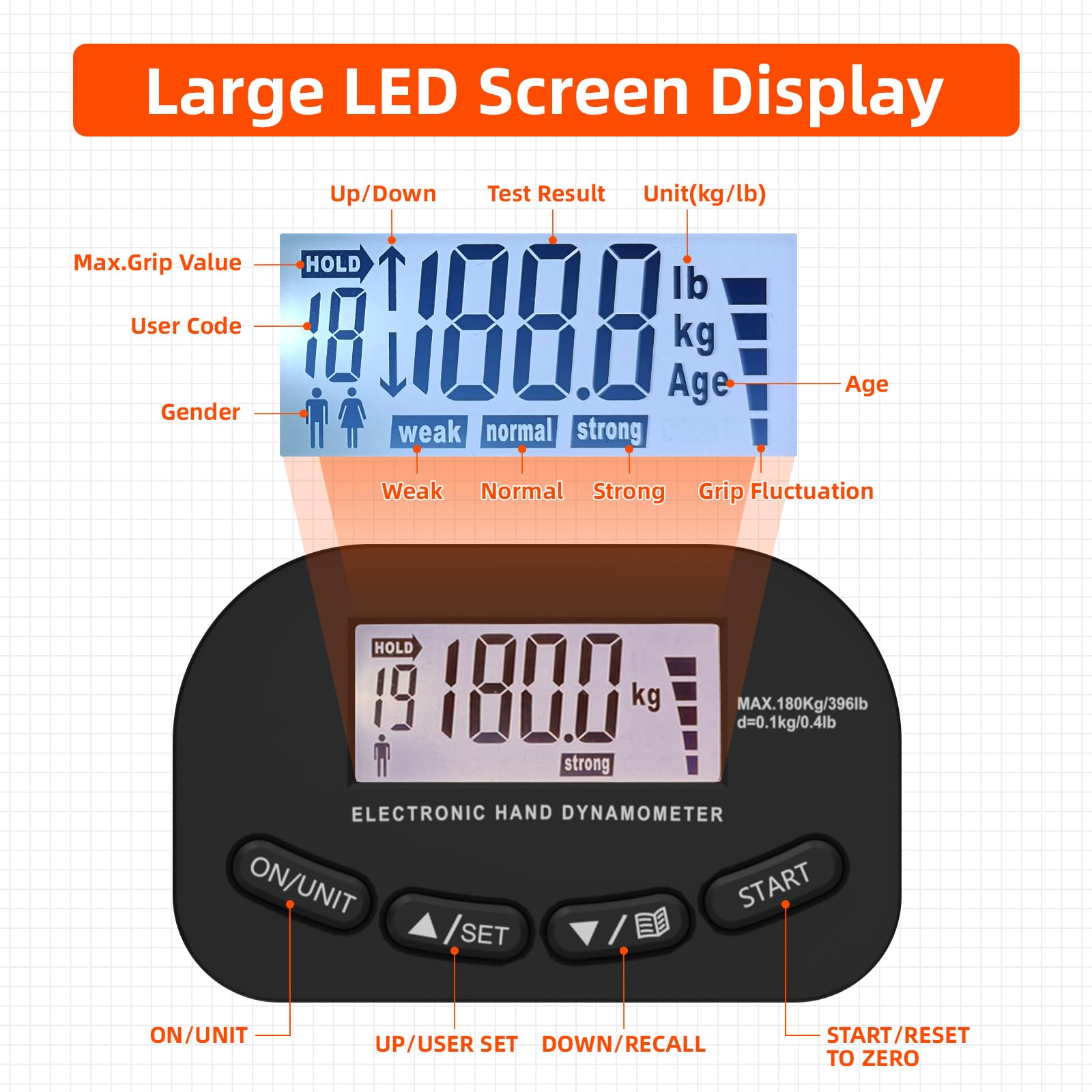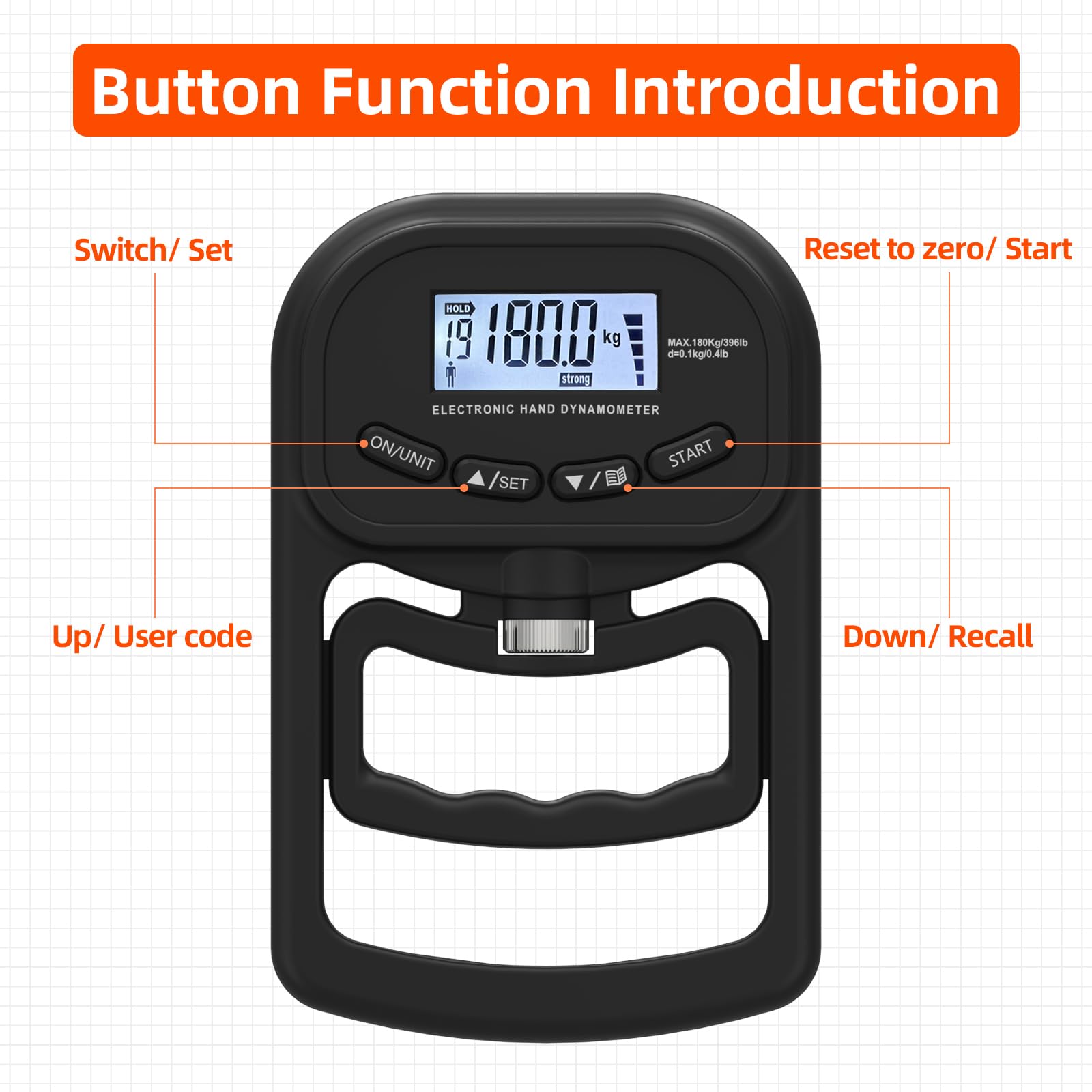 - đȘăAccurate and Precise Measurementă - inaepeak electronic hand dynamometer is equipped with a high-precision strain gauge sensor, which can provide accurate grip strength values. It can withstand a maximum grip force of 180kg/396lbs, and the value can be measured accurately to 0.1kg/0.1lb. This grip strength trainer can be widely used in physical training, sports and clinical applications.