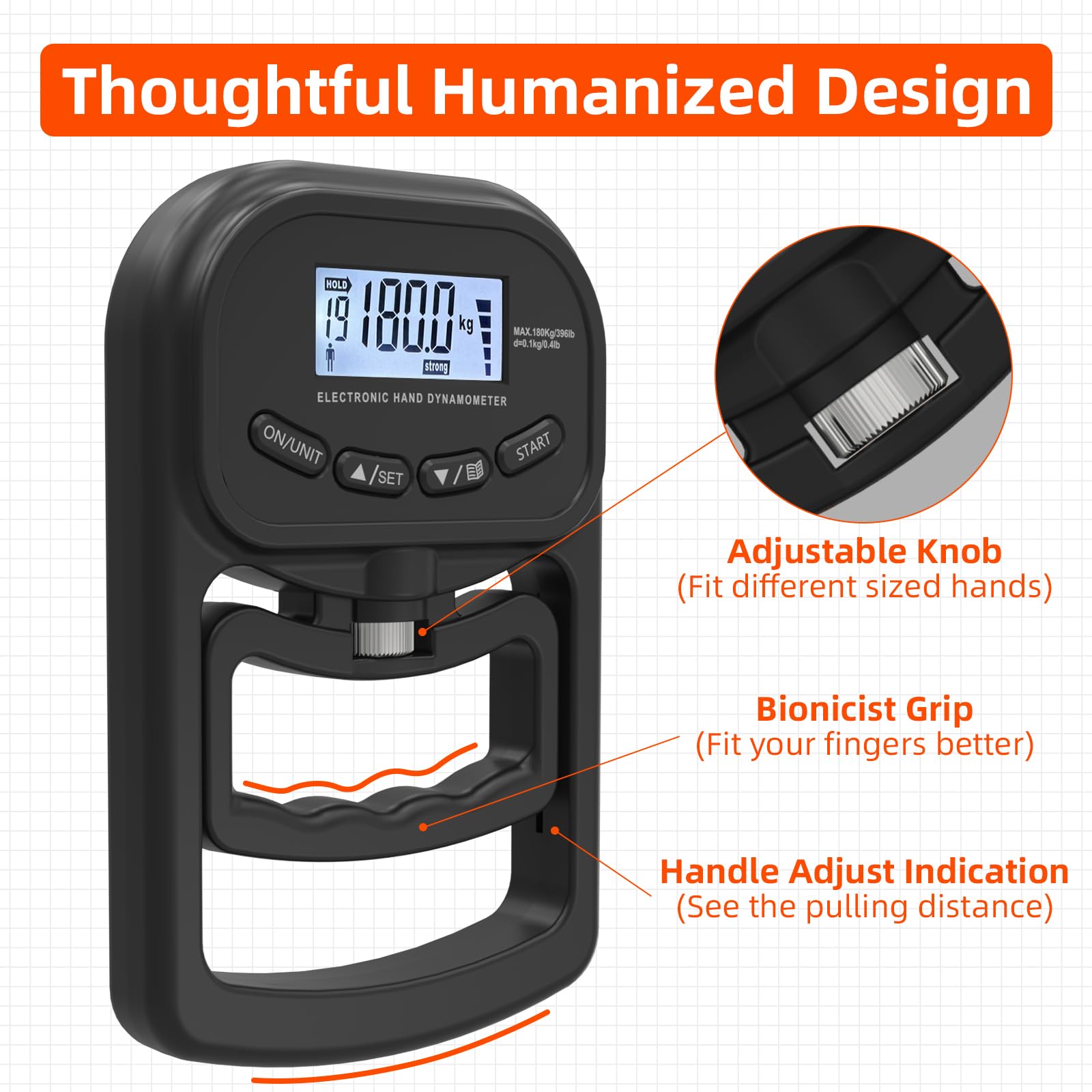 - đȘăThoughtful Humanized Designă - Our hand grip dynamometer comes with adjustable handle that can be adjusted to different lengths to fit different sized hands, ensuring a comfortable grip for more accurate measurements. The grip of this grip strength trainer has a wavy design on the handle to better fit your fingers, and the bottom is rounded so that no matter how much force you use, your hand will not feel uncomfortable.