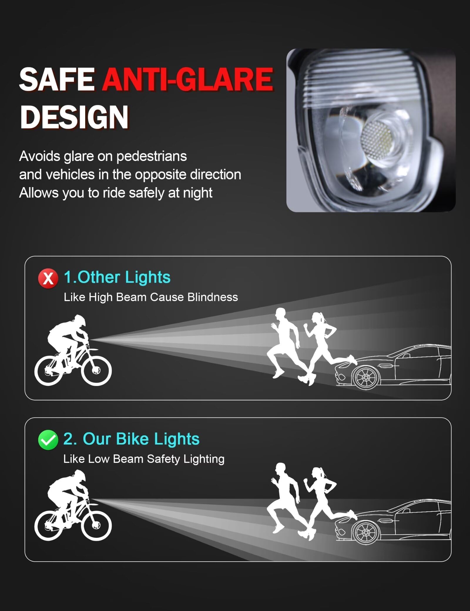 - ✅[Secure Anti-glare Design]: The "anti-glare" design moves the beam downward to avoid blinding oncoming drivers or pedestrians, improving the safety of night riding on the road.