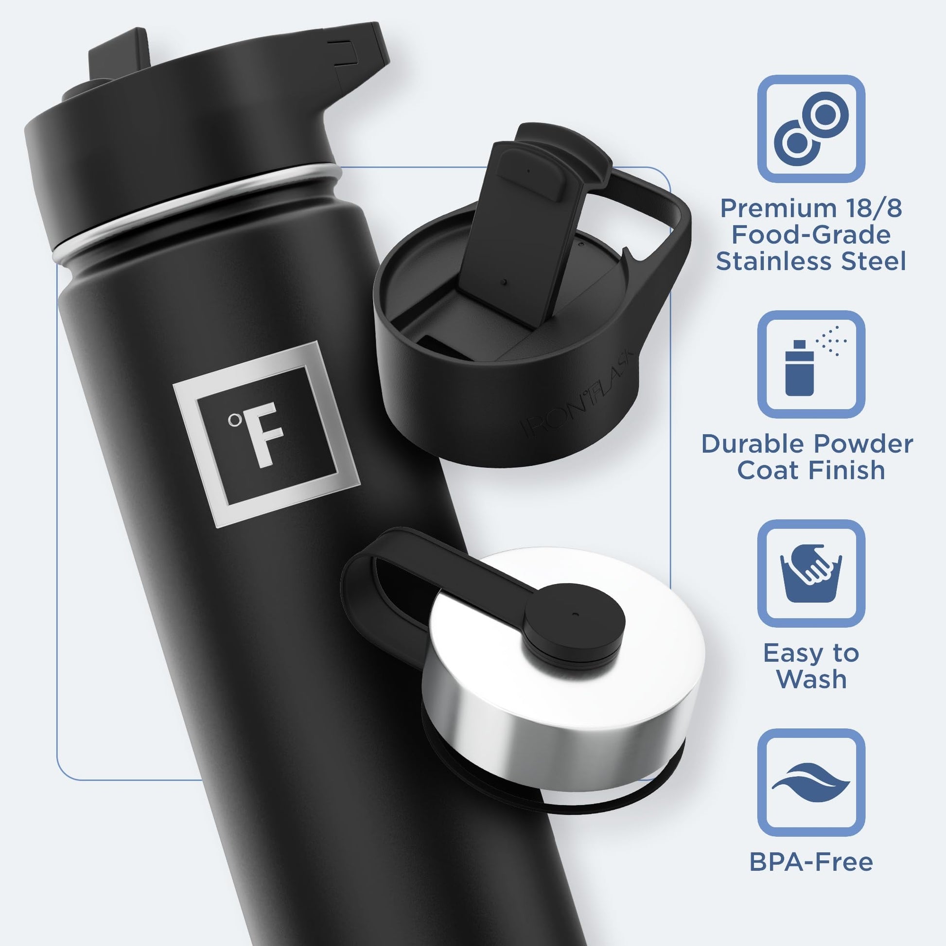 - 3 LIDS: YES, Iron Flask comes with THREE different leakproof lids. Carabiner Straw Lid with 2 Straws, Flip Lid, and a Stainless Steel Lid! *NOTE: The stainless steel lid is plastic from inside and stainless steel from outside*