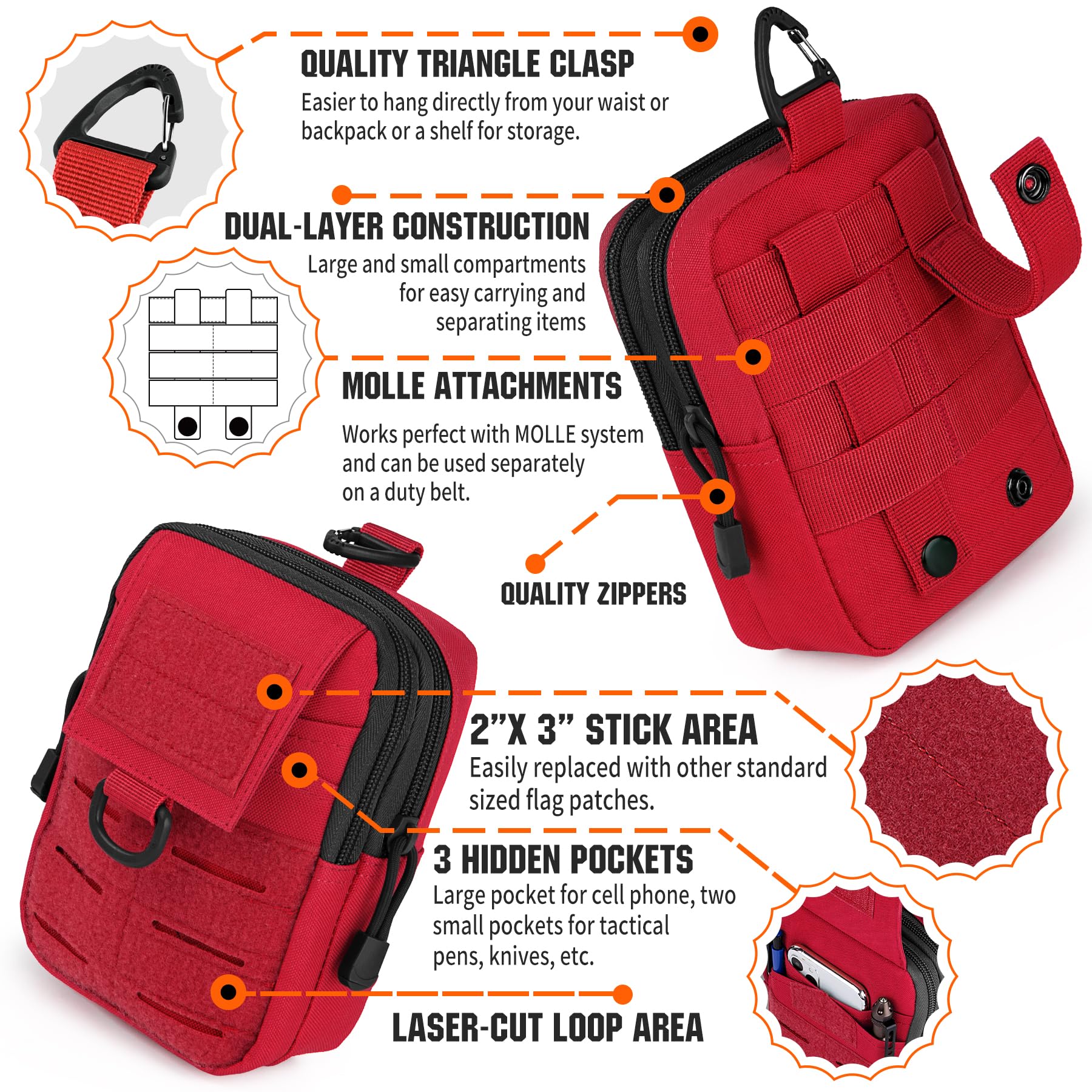 - Roomy Pockets: both 2 zipper main pockets have 1 slip pocket inside, outside with 1 hook&loop closure phone pocket that can be took in and out your phone easily. Great for holding your phone, pen, keychain, medical supplies or any necessary gadgets you need.
