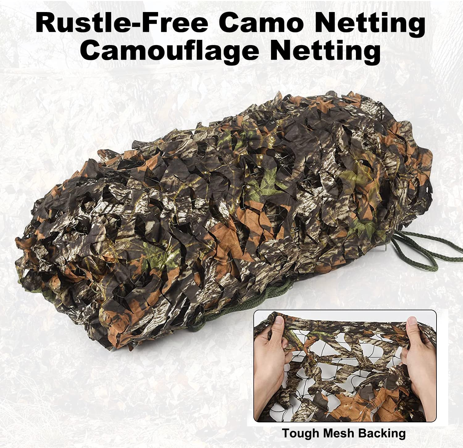 - Camo Netting with Realistic Print: The camo net is made of 150D polyester oxford fabric material and 3D leaf-like foliage camo print. The camo net leaves color can blend in well with the surrounding dead leaves in the forest. The camo net with tough mesh backing for added strength when tugging or pulling on nets to cover larger items, which can resist stronger wind. Silent, soft, tear-resistant material with camo bionic leaves.