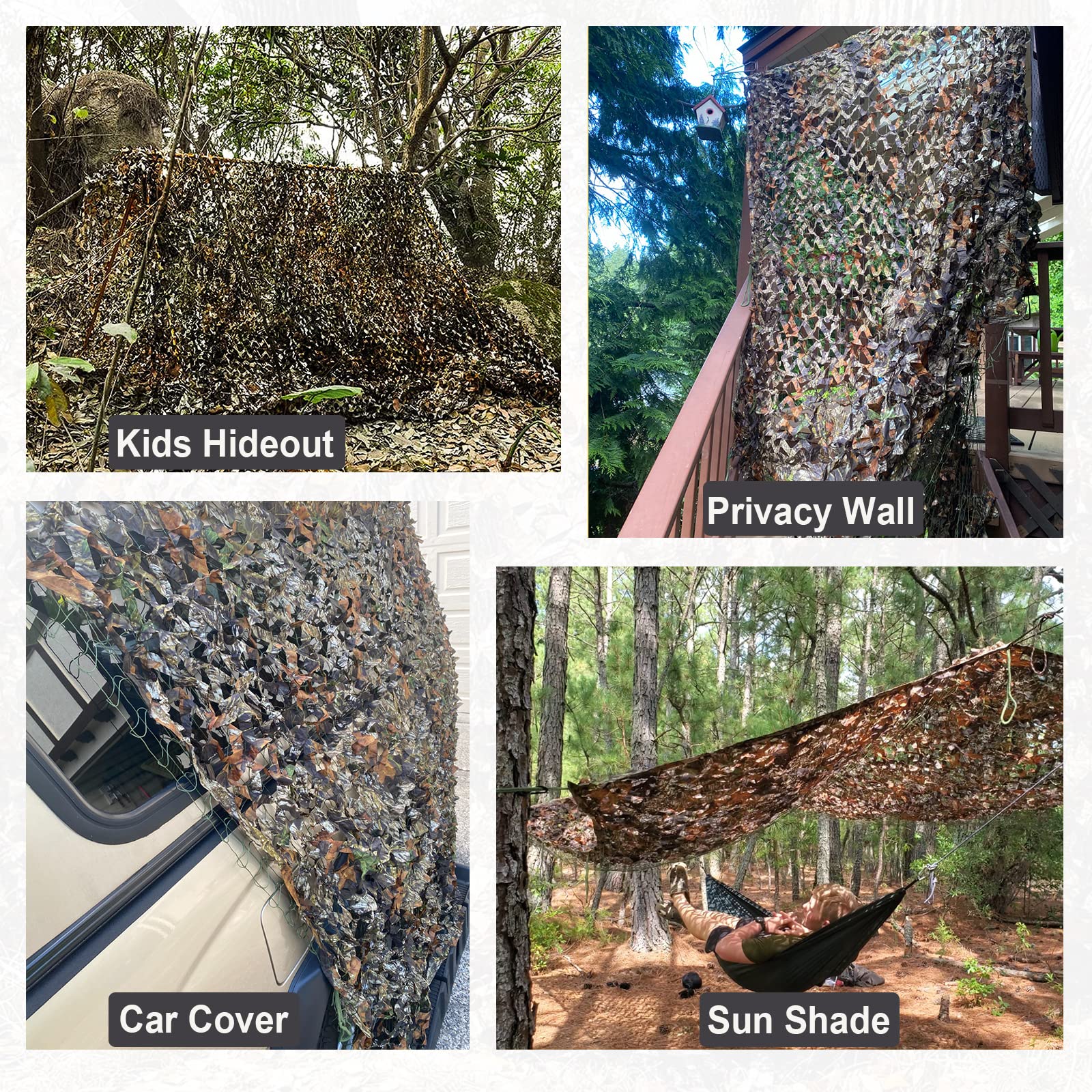 - Military Camouflage Net with Multi-Function: This netting is pretty cool and versatile! Great for hunting blinds, roof sunshades, ground blinds, garden fences, wildlife watching hideouts, boat-cover, outdoor sports, fishing, military activities, room divider, camping, CS games, nature observation, photography, Army-themed party, and home decoration.