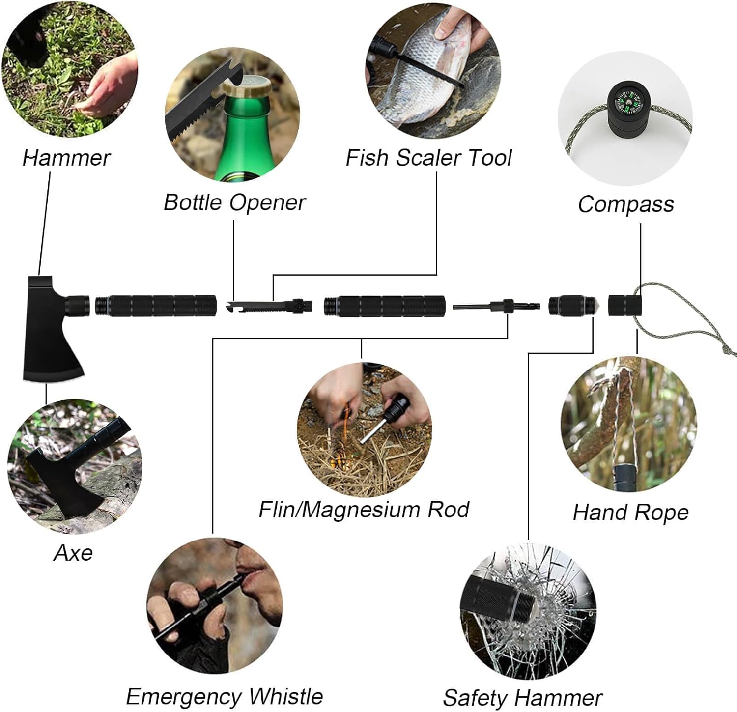 - Hatchet with Ingenious Tubular Engineering - This survival axe kit assembles or disassembles smoothly, it can be a short axe if you are in a compact situation or fully assembled for regular use. Different sizes for different trips. The tube sections each have available space for small first aid kits, fishing gear, OR survival gear. This is a good "back up" multi tool hatchet to have for "just in case" needs