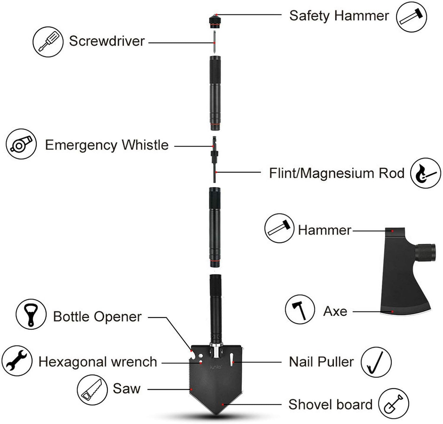 - Versatile Military Shovel: Features a regular survival shovel doesn't even have: shovel board, saw, bottle opener, whistle, pickaxe, nail extractor, hoe, compass. iunio collapsible shovel is assembled practicability, functionality and security in it