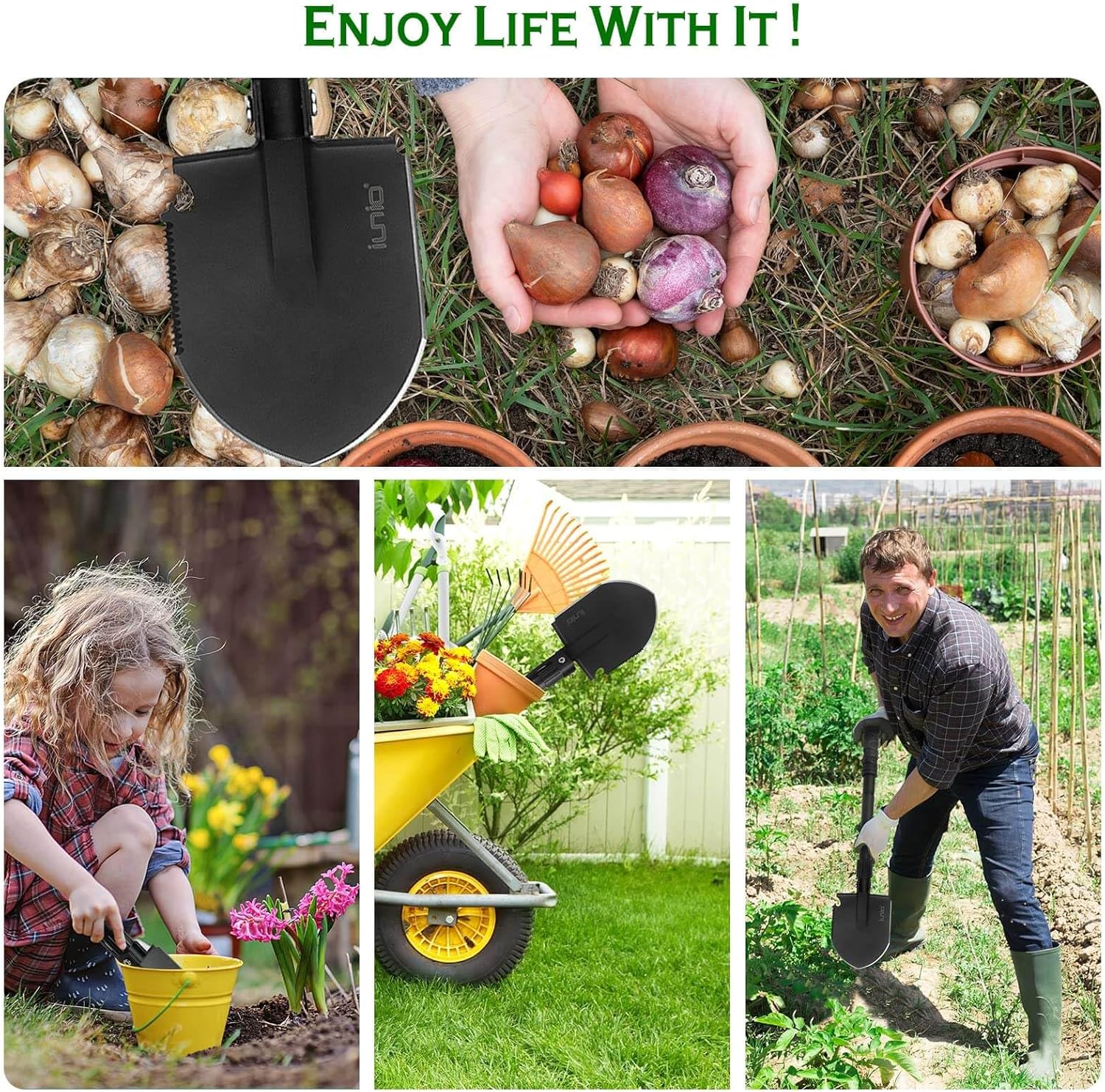 - Sturdy & Built to Last: iunio camping folding shovel blade and handle are made of high-carbon steel which is high-strength and wear-resistant. The grip on the handle is made of rubber and this shovel has passed the durability tests and our destruction tests