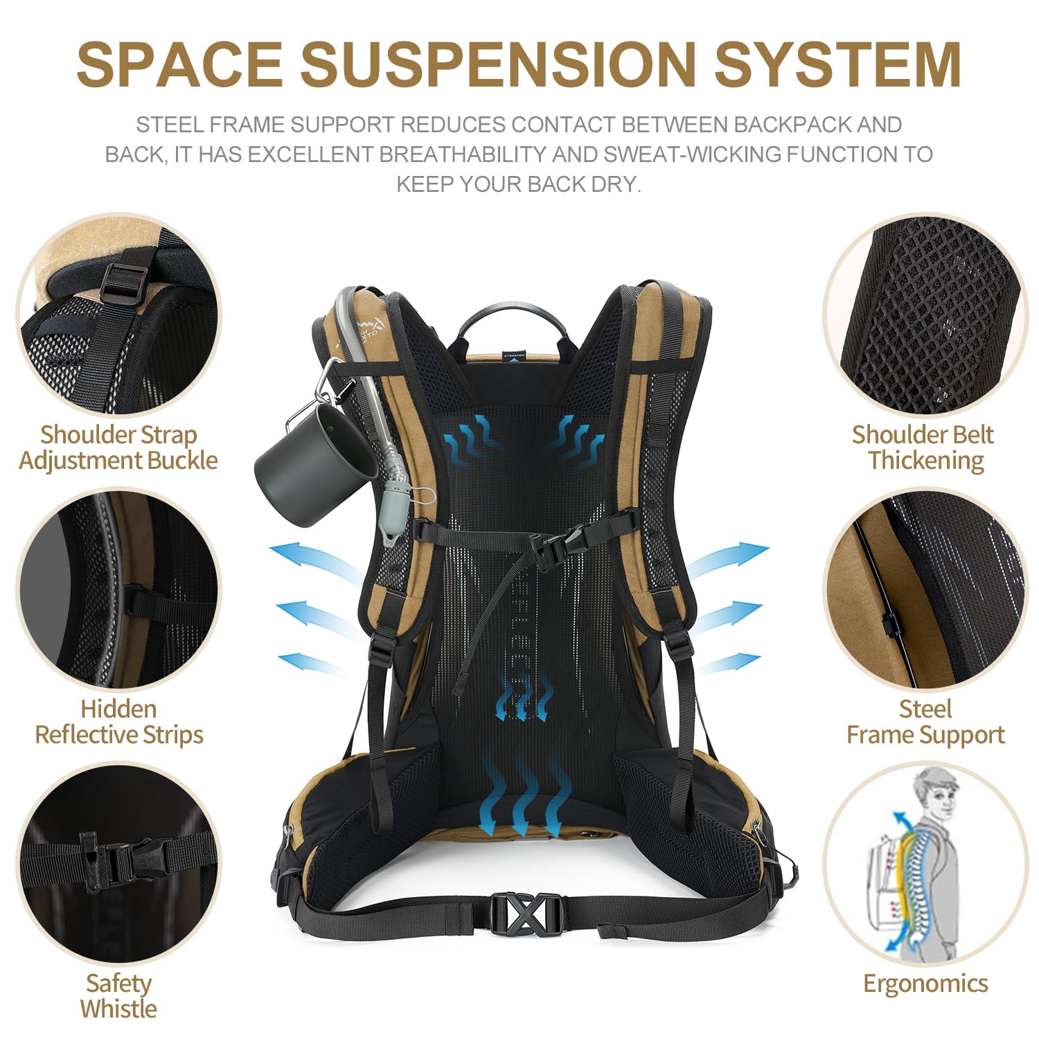 - 【Ergonomic Breathable Technology】Our Camping Backpack are 20.4 x 11.8 x 5.9 inches, 35L. Features a cutting-edge 3D touch suspension system that keeps your back comfortable and relaxed during travel. Breathable mesh on the back fabric can reduce sweating for extra comfort. Using steel frame support, the force is more evenly distributed, effectively alleviating the problems of muscle soreness caused by long-term weight bearing. Reflective design increases visibility and makes it safer at night.