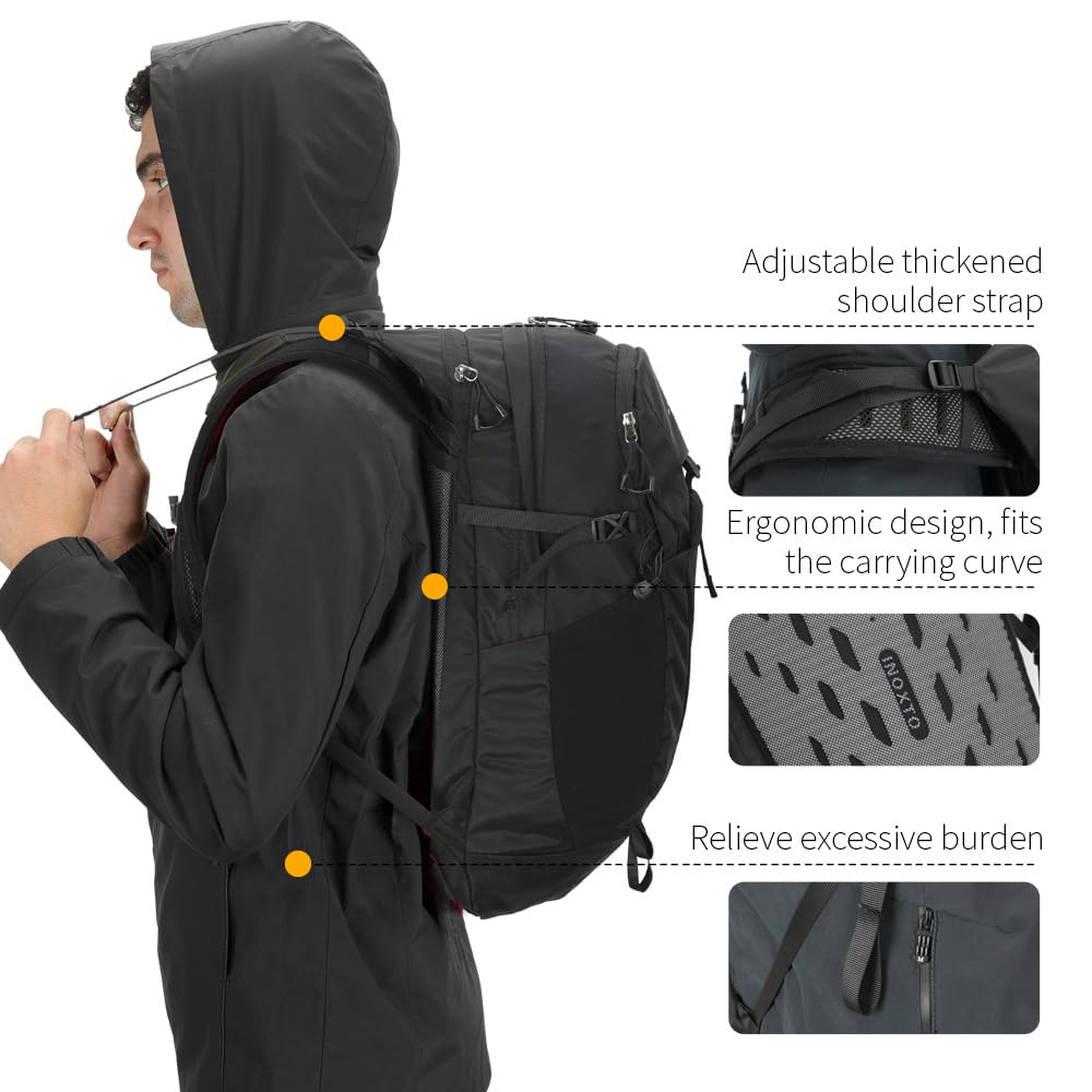 - 【Water-Resistant And Durable Material】Our IX INOXTO Hiking Backpack is made of high-density polyester material, water-resistant, tear resistant, with good abrasion resistance and environmental protection, suitable for any outdoor environment.High-quality durable zipper, well-sewn craftsmanship, high dense stitching. All of the backpack's stress points and shoulder straps are reinforced with lap-knots to ensure long lasting durability. Waterproof backpack comes free with a waterproof rain cover.