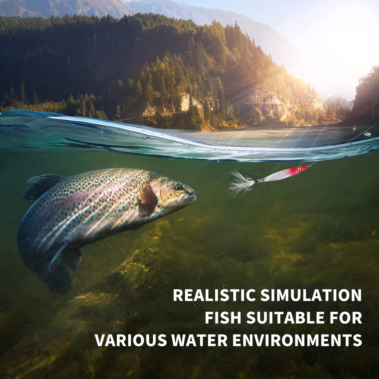 - Saltwater fishing lures kit, 5PCS laser holographic painted lures included. Slow picth jigging design with stream-line body shape can make a life-like swimming action in water and rapid diving action into the river, swimming as a real fish in deep water