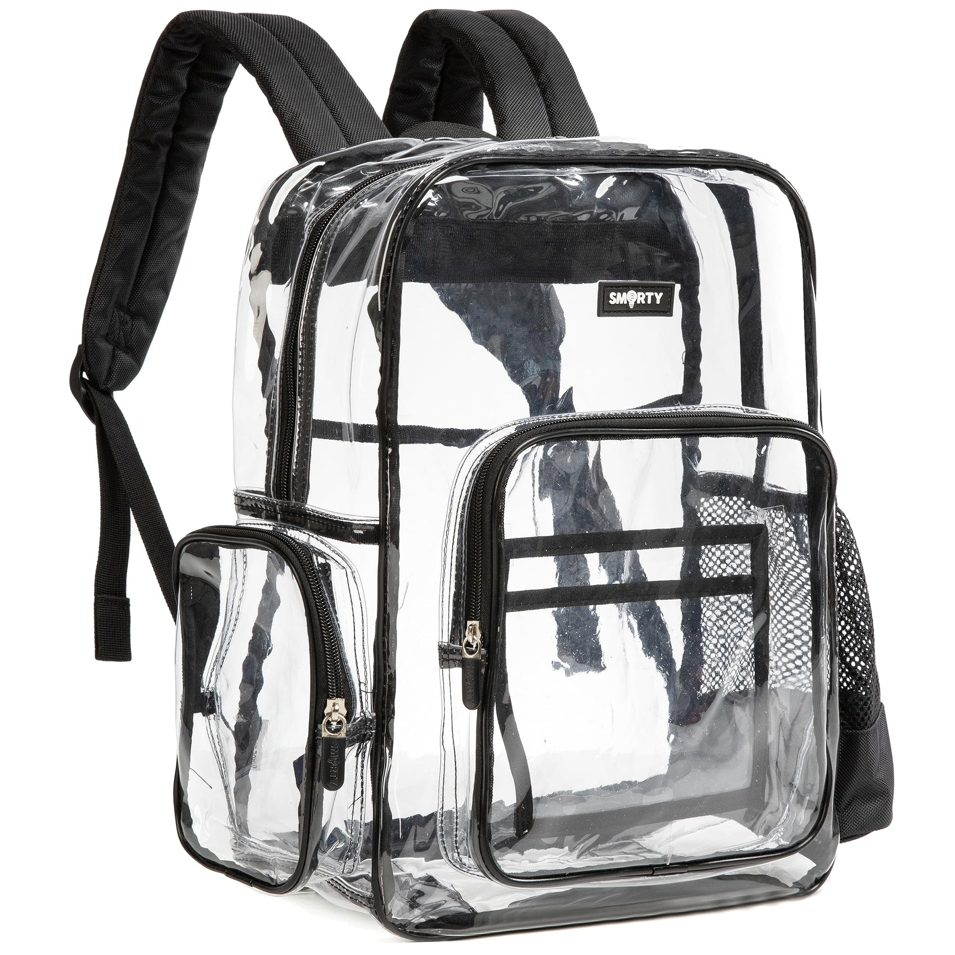 - The clear backpack is made of odorless thickened PVC material, that is large enough for a durable transparent backpack, high quality heavy duty transparent material and high strength stitching. Reinforced stitching to hold the shoulder straps securely in place;