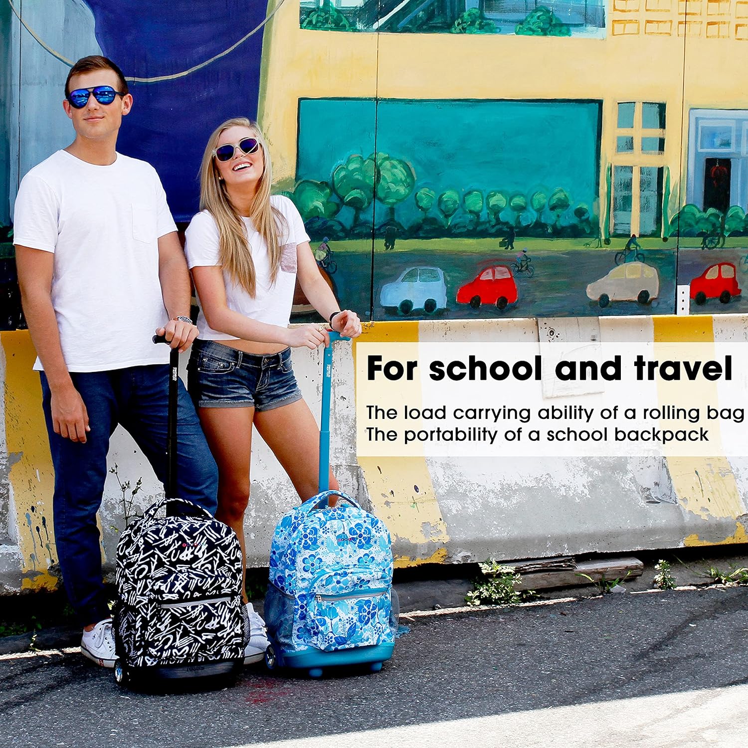 This rolling backpack for women and men converts from a rolling back on wheels into a wearable backpack with shoulder straps. Features a large main compartment, 2 mesh side pockets and a front pocket organizer. Measuring 18 x 13 x 9 inches, this backpack is also designed to be used as an underseat carry on bag for airplane travel. The single-tube aluminum handle extends to 34 or 39 inches for easy maneuverability by heights up to 6’ 3” tall. Telescoping handle stores nested in bag. Rubber bottom holds up to the punishment of dragging on pavement. No more holes in the bottom of your rolling backpack! Made of durable ripstop polyester fabric with a metal frame and reinforced edges, this rolling backpack for boys and girls has a water resistant coating to keep your gear dry. Reflective tape gives night visibility. Features cushioned air mesh shoulder straps and back pad, or use the padded handle to carry this rolly backpack for girls and boys. This bag with wheels quickly converts into a wearable backpack when going up stairs or over rough ground, just pull out backpack straps. To convert back to a rolling travel backpack, simply tuck the straps away in the back pocket—no having to unzip. Large rubber backpack wheels roll and turn effortlessly on sidewalks, paths and airplane aisles. Corner mounted wheels provide extra stability. Our Promise - at J World New York, we stand behind our products 100%. If you have any issues with this rolling backpack, we will make things right