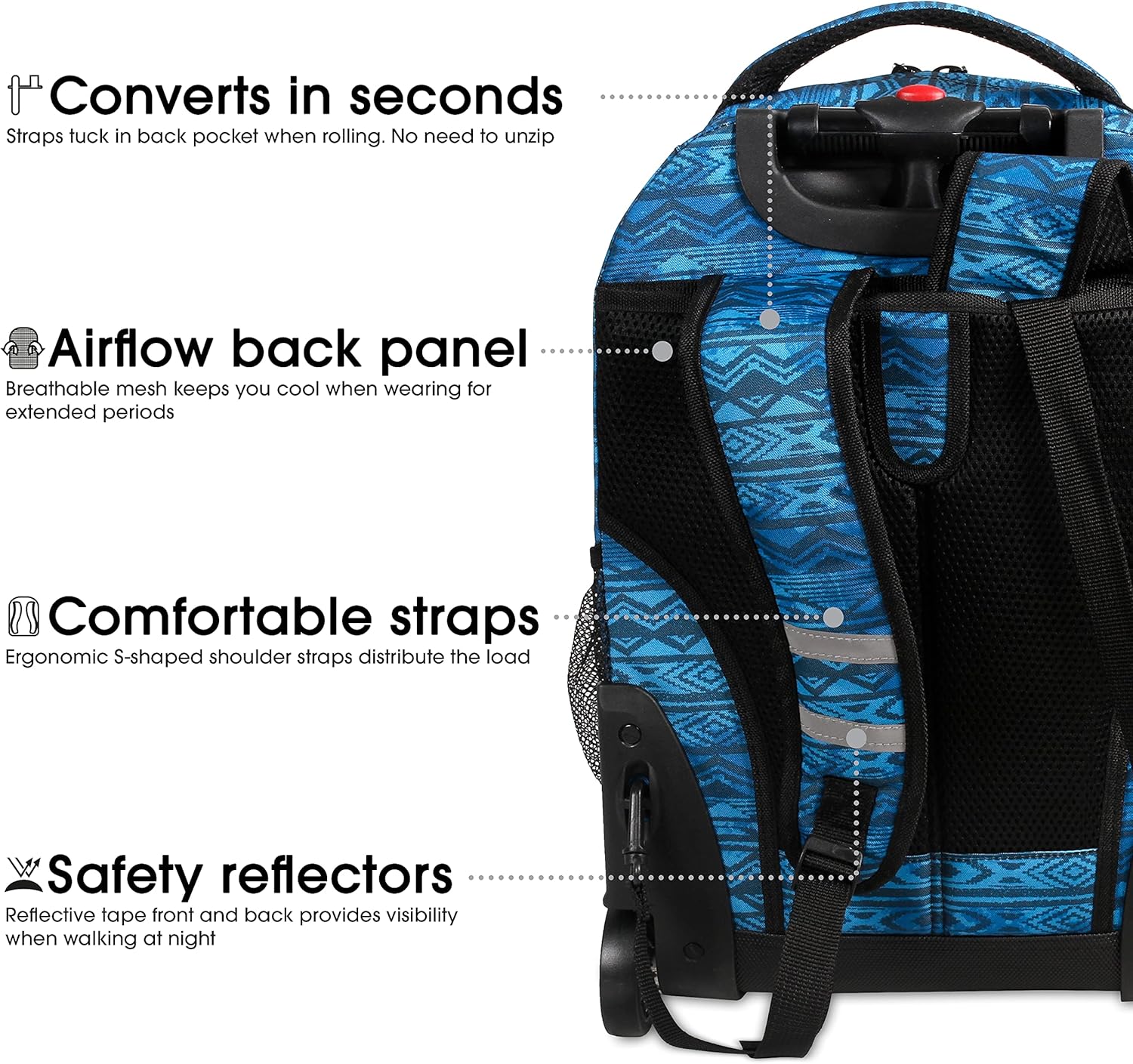 - Rolling Backpack — Convertible wheeled backpack offers the load carrying ability of a rolling bag with wheels and the portability of a school backpack. For teens and adults who carry a lot