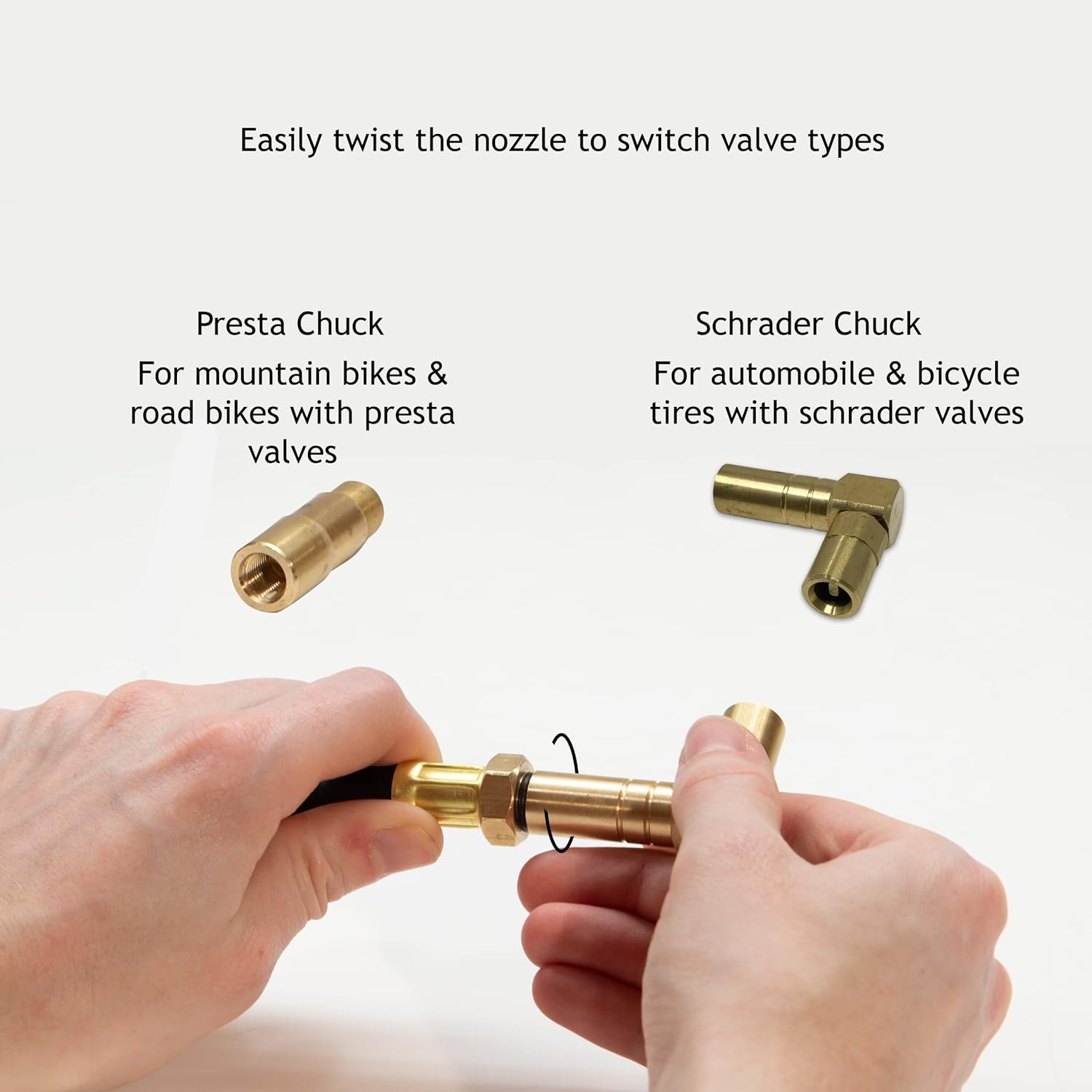 - Feels sturdy in the hand & built from solid brass shielded by our rugged gear-style protective shock guard; features flexible leak-proof hybrid air hose to easily get in between the spokes