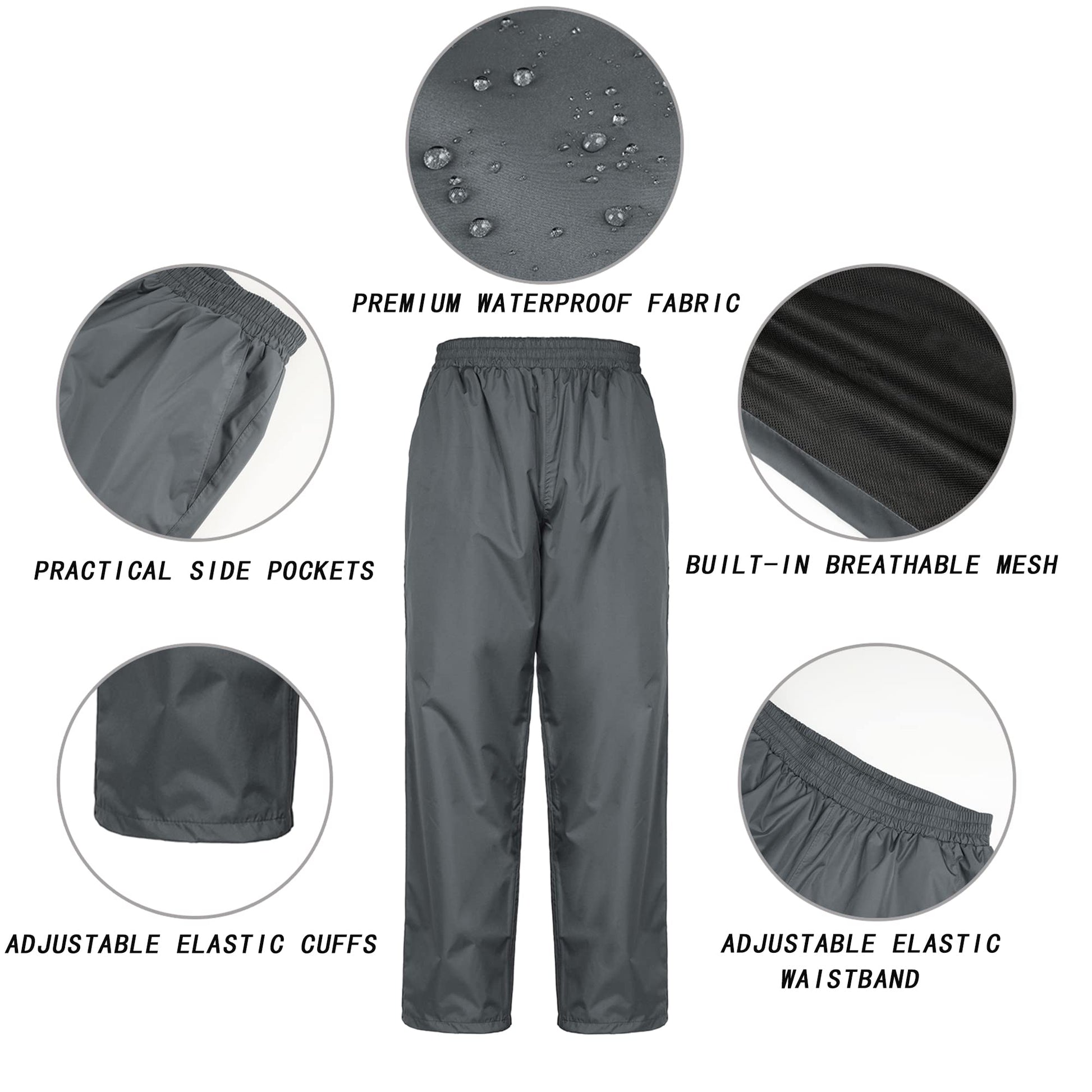 - Rain Suit Pants: Waterproof hiking rain gear pants is fully elasticated waistband,adjust the drawcord at hem and leg openings, so you can customize your fit easily.The closure at bottom leg allows adjust the width for different fits and occasions